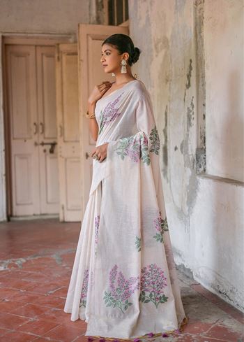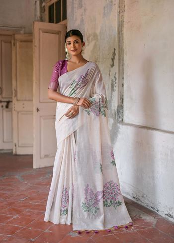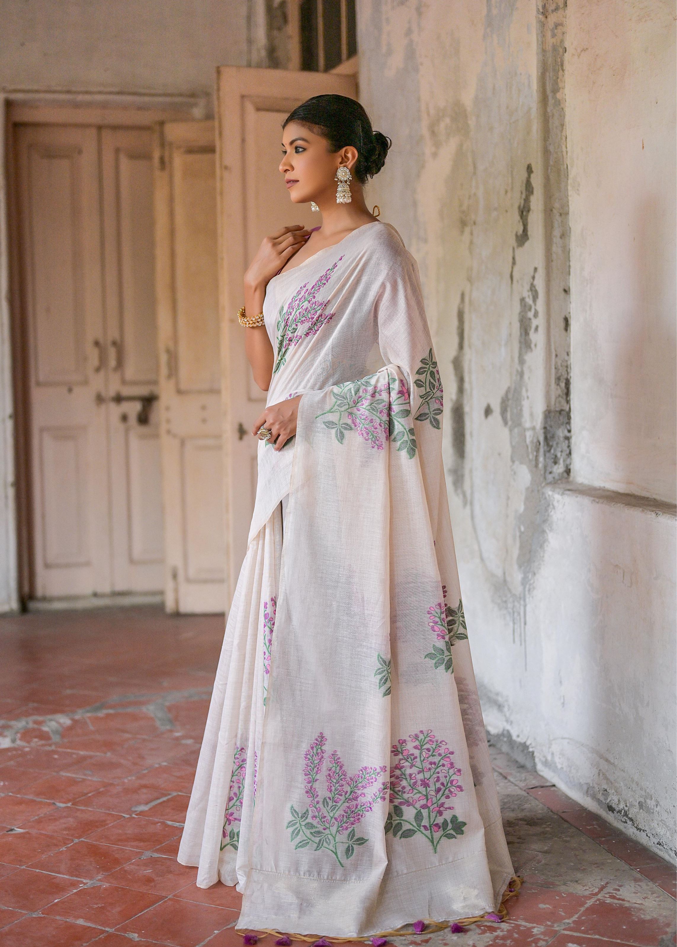 Beautiful Floral Weaving Designer Off White Muga Cotton Rich Looks Saree