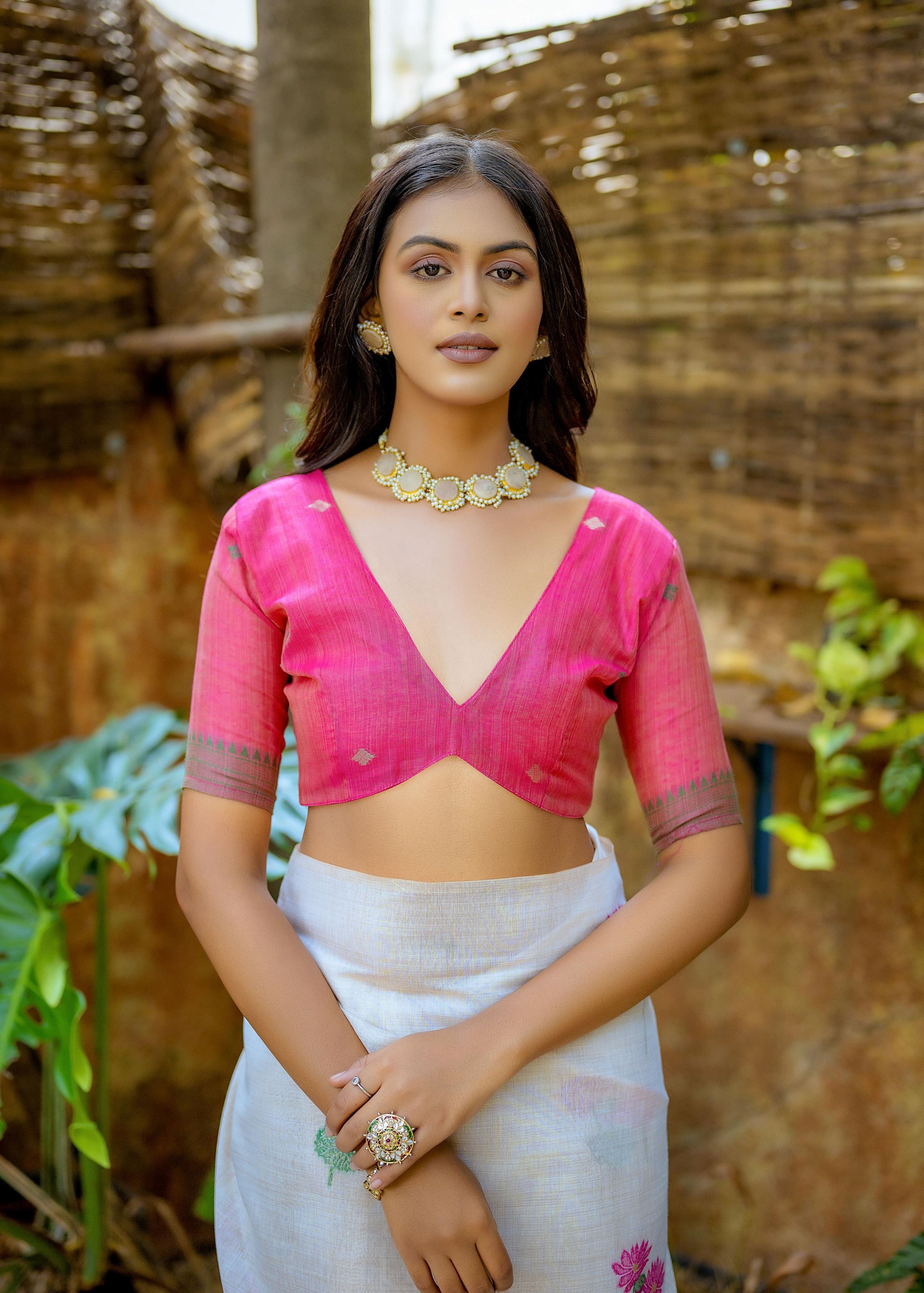 Celebrate timeless elegance with this Beautiful Floral Weaving Designer Off White Muga Cotton Rich Looks Saree from Aethnofit Fashions. Crafted in blended cotton, this saree captures the richness of muga cotton while keeping it lightweight and comfortable for all-day wear. The off-white base is enhanced with delicate floral weaving, showcasing intricate craftsmanship and ethnic charm. A soft pink blended cotton blouse complements the saree, creating a graceful and feminine appeal suitable for any occasion.