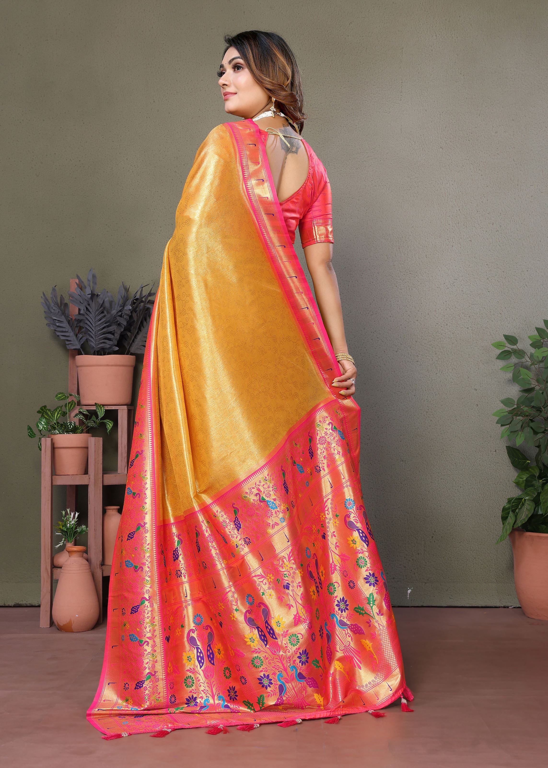 Complementing the radiant mustard body is the contrasting pink silk blend blouse, designed to add a lively pop of color while enhancing the saree’s celebratory aura. This versatile combination allows you to style it with classic jewelry—whether antique gold, temple ornaments, or modern statement pieces—creating an ensemble that turns heads effortlessly.Lightweight yet opulent, the Banarasi tissue silk drapes beautifully, making it an ideal choice for women who wish to stay comfortable without compromising on grandeur.A celebration of culture, elegance, and beauty, the Mustard Banarasi Tissue Silk Partywear Saree is more than attire—it’s a reflection of grace and timeless tradition.