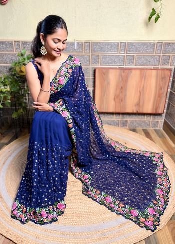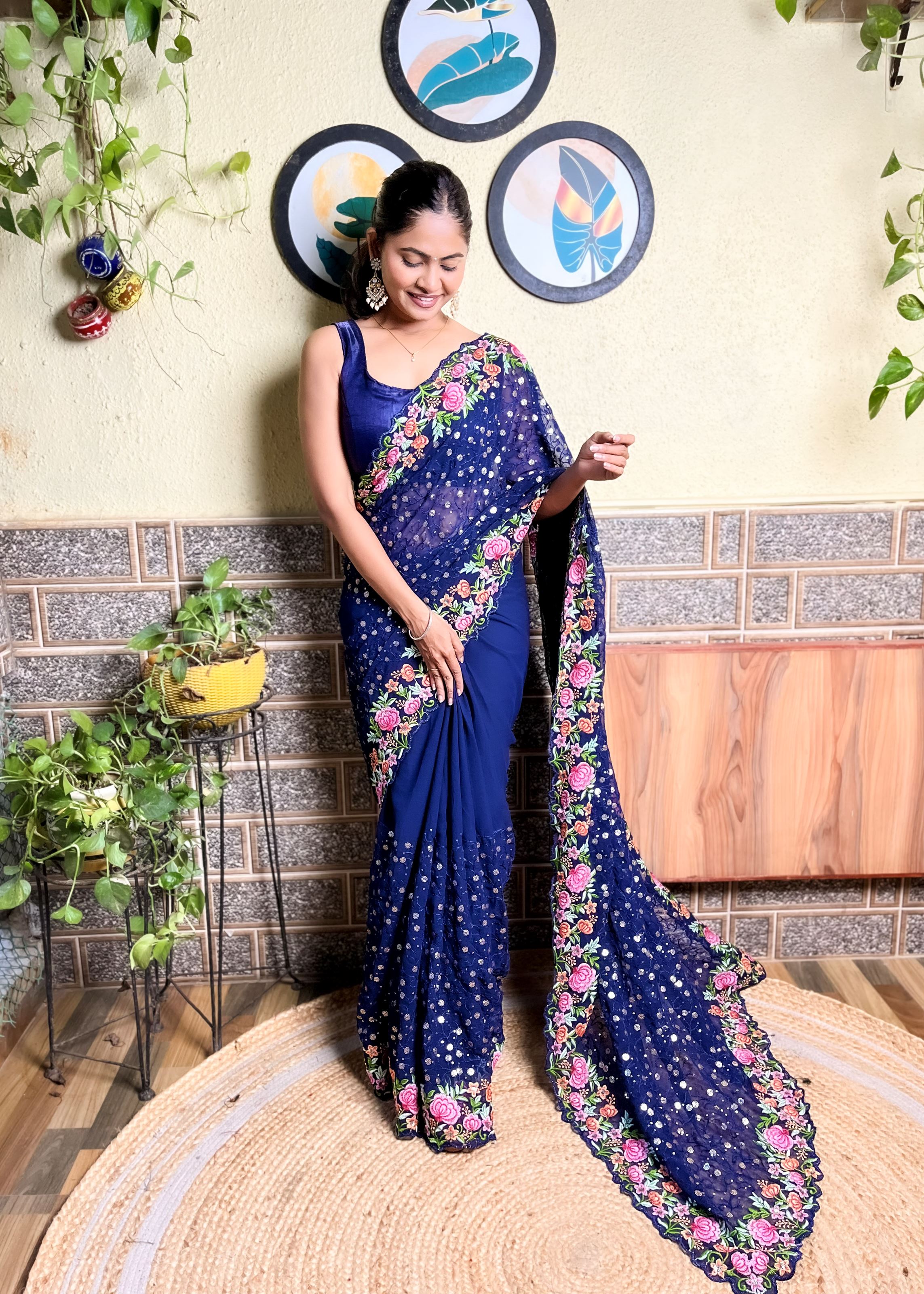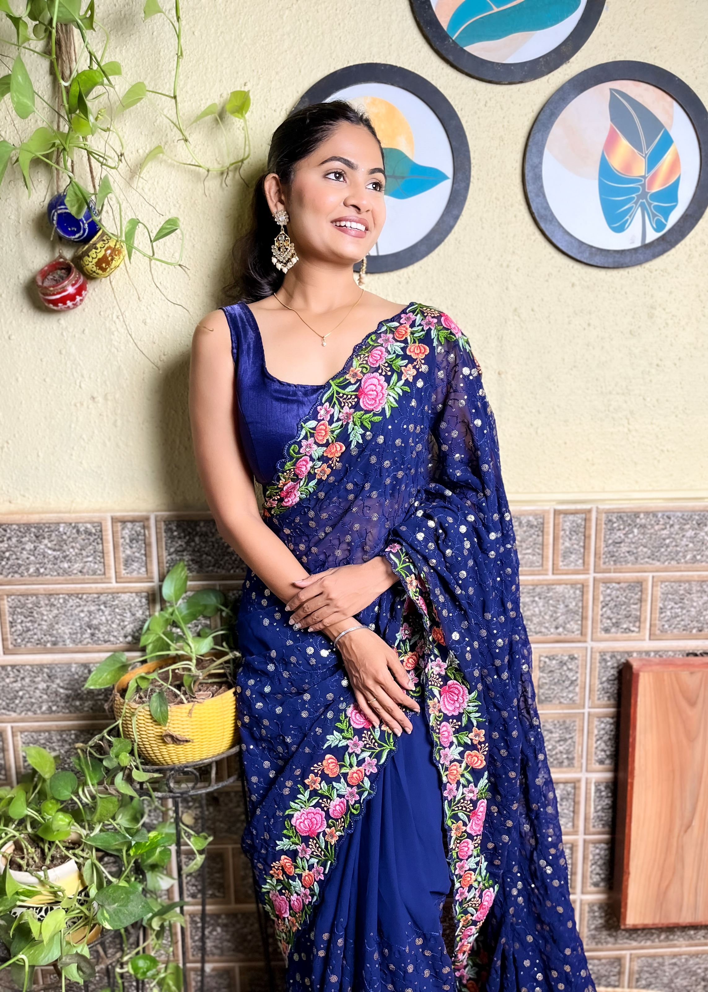 Beautifully Designer Georgette Navy Blue Saree With Glamorous Embroidery Work For Ceremonial Wear