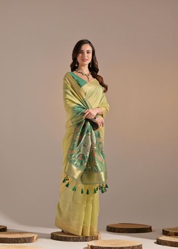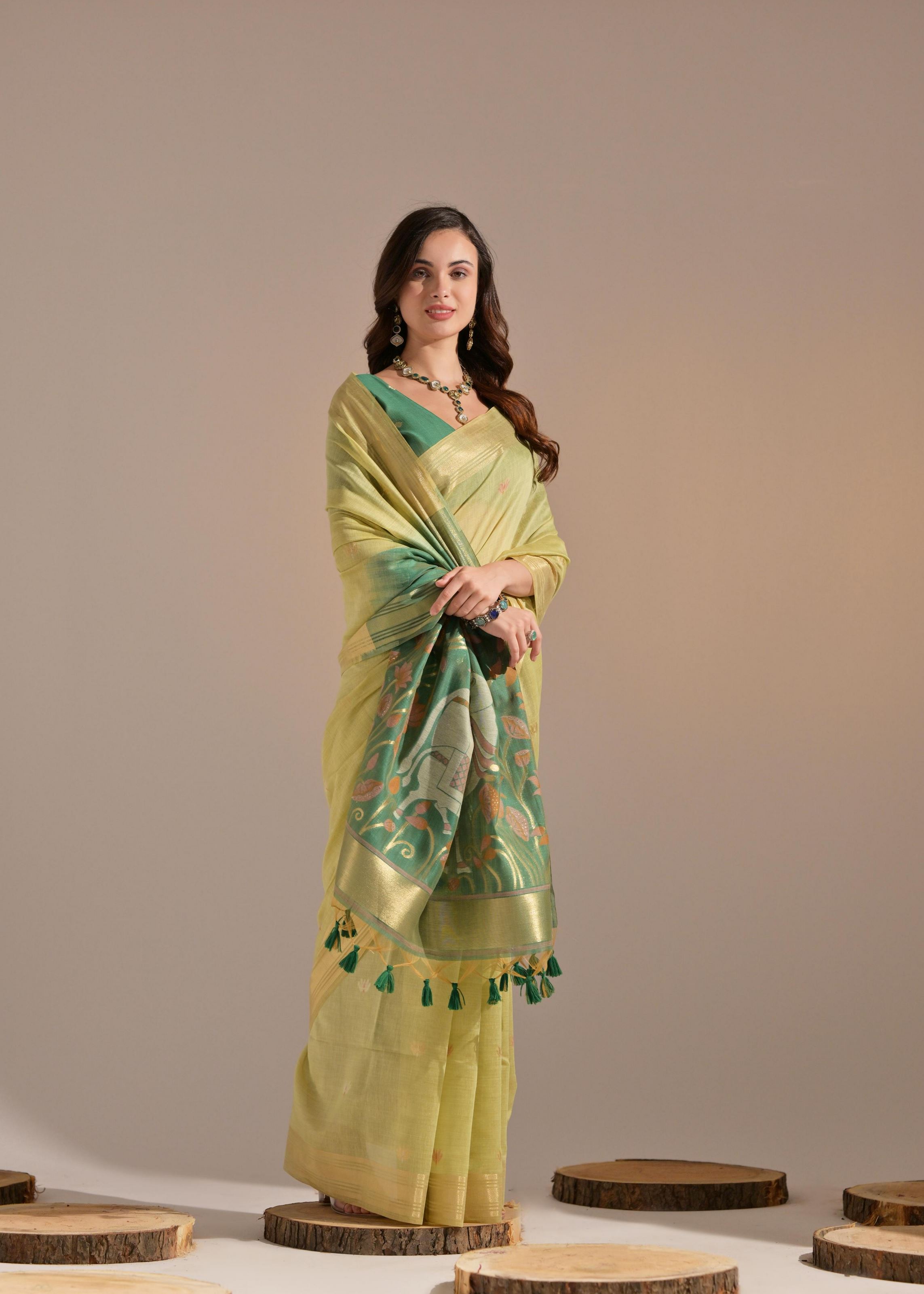 The soft beige base is complemented by a contrasting green blended cotton blouse, creating a subtle yet charming appeal. Its lightweight fabric and graceful drape ensure effortless styling, allowing you to enjoy both comfort and elegance in every occasion. Designed for women who appreciate traditional craftsmanship with a contemporary touch, this saree is a versatile addition to your ethnic wardrobe.