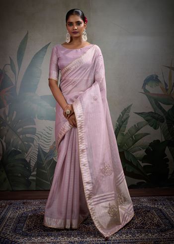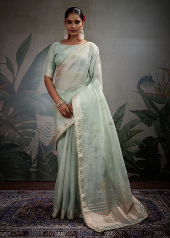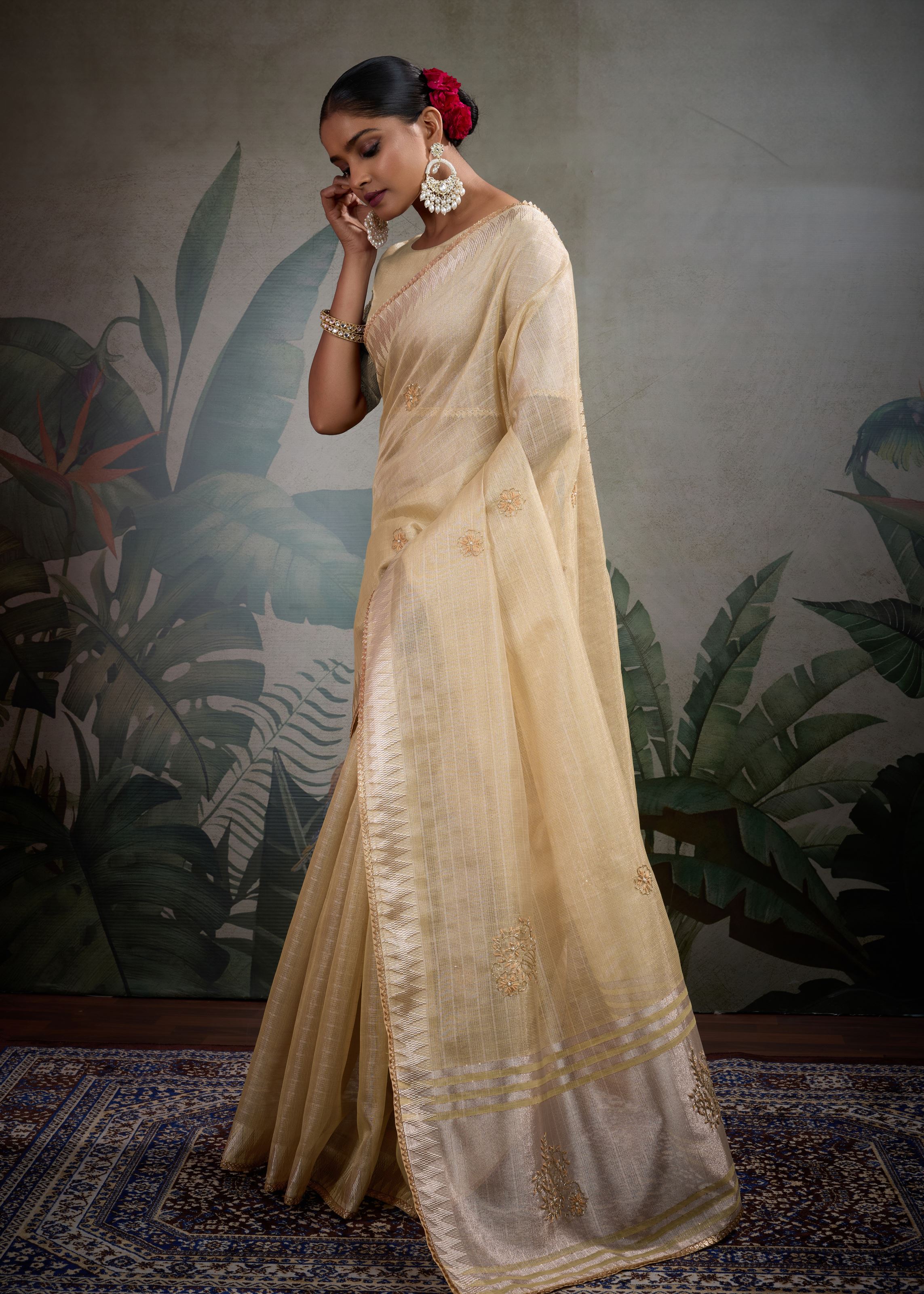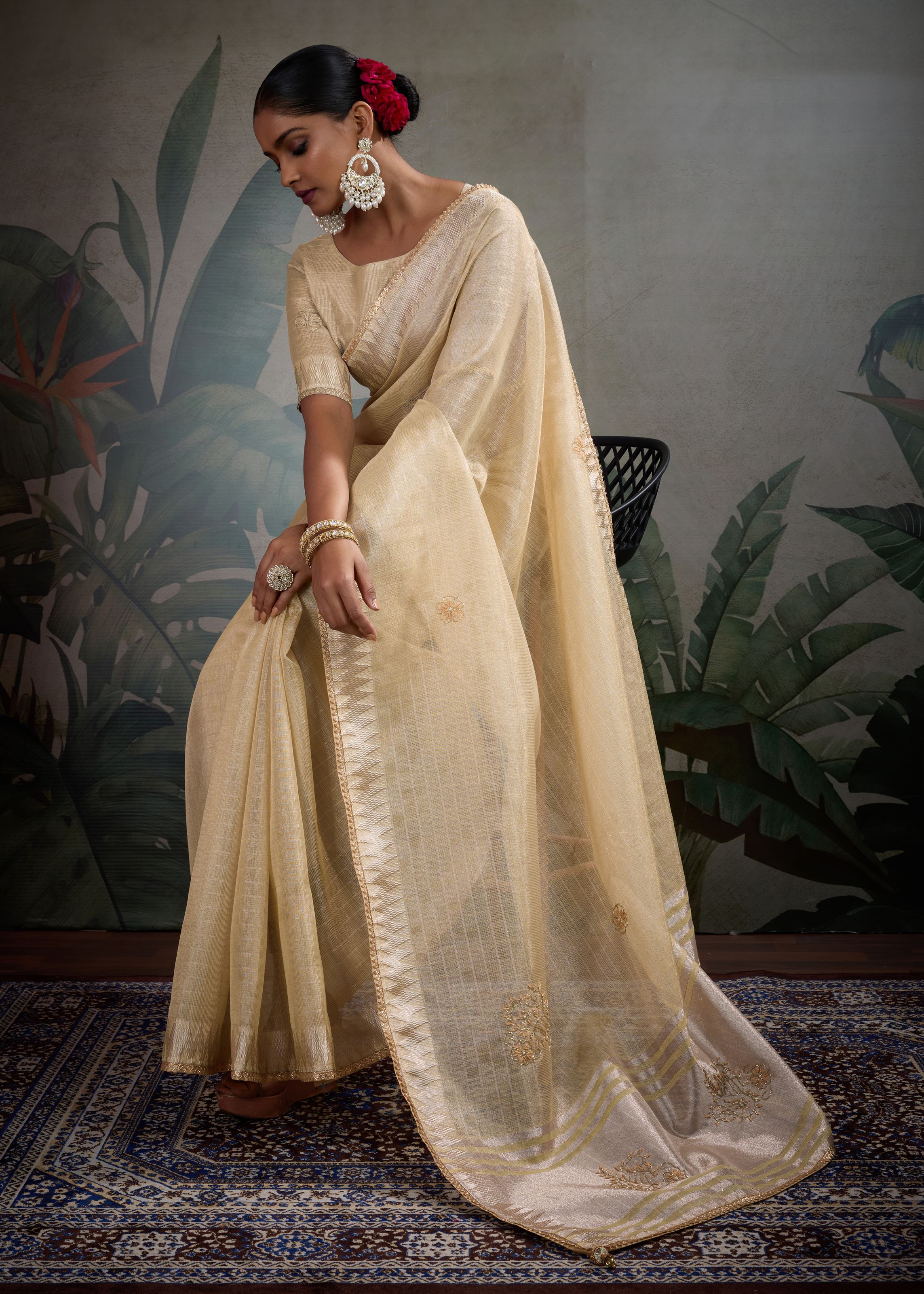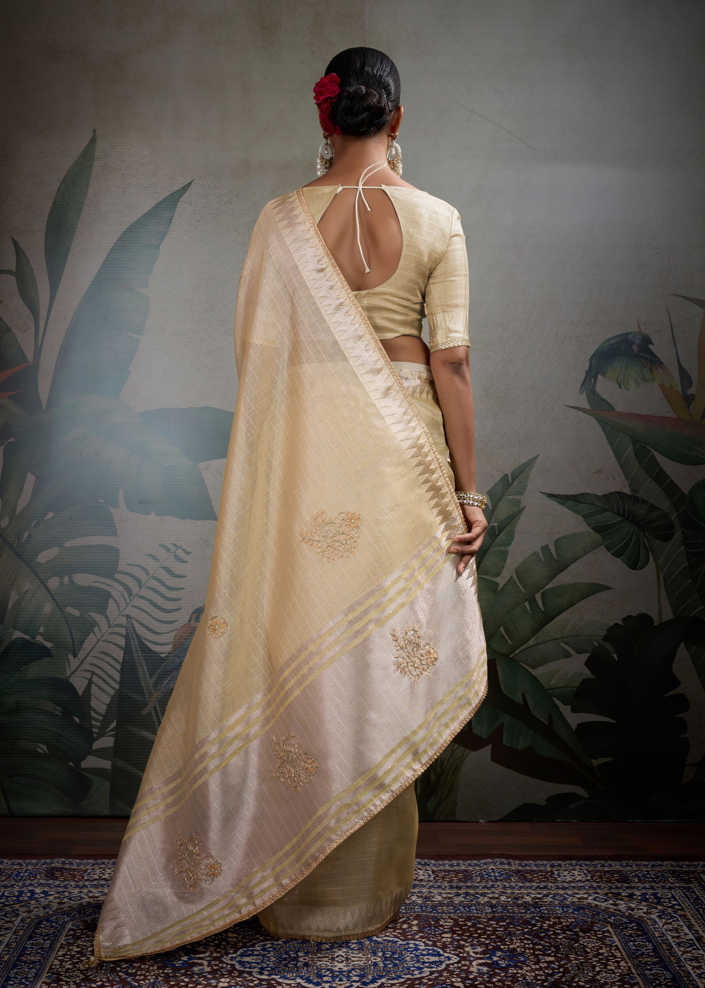 Adorned with delicate handwork featuring butta motifs, this piece is intricately embellished using zardosi, cutdana, pearl, and fine thread work. The artistry on display elevates this beige drape from simple to stunning, offering just the right amount of elegance for women who favor subtle luxury. Paired with a matching beige linen tissue blouse, the ensemble creates a seamless and polished look, ideal for making a statement without being loud.