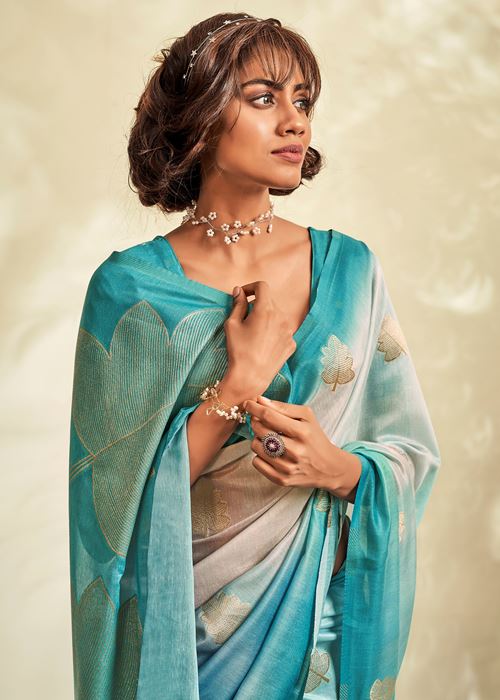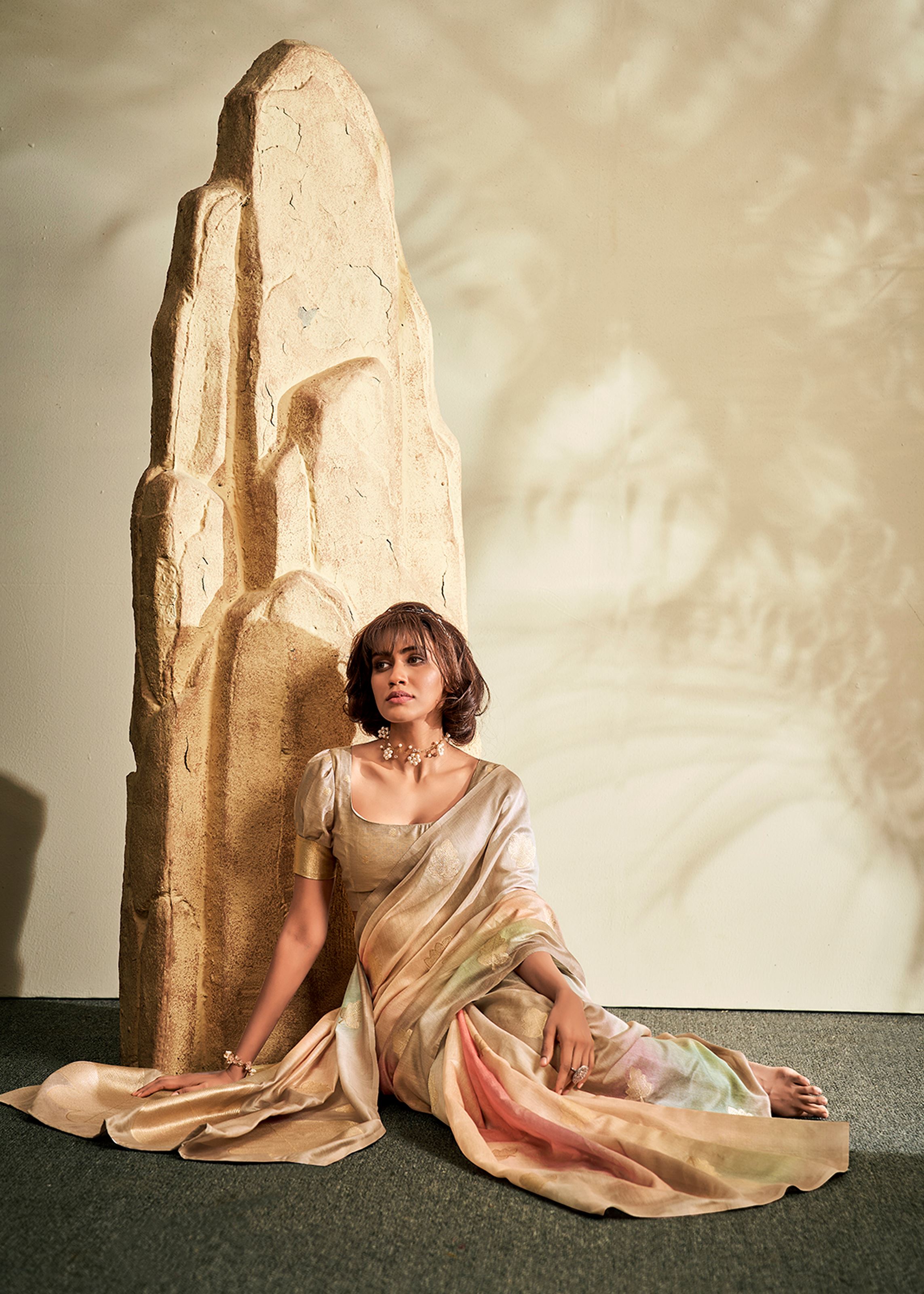 Beige Handloom Khadi Saree With Jacquard Woven With Digital Print