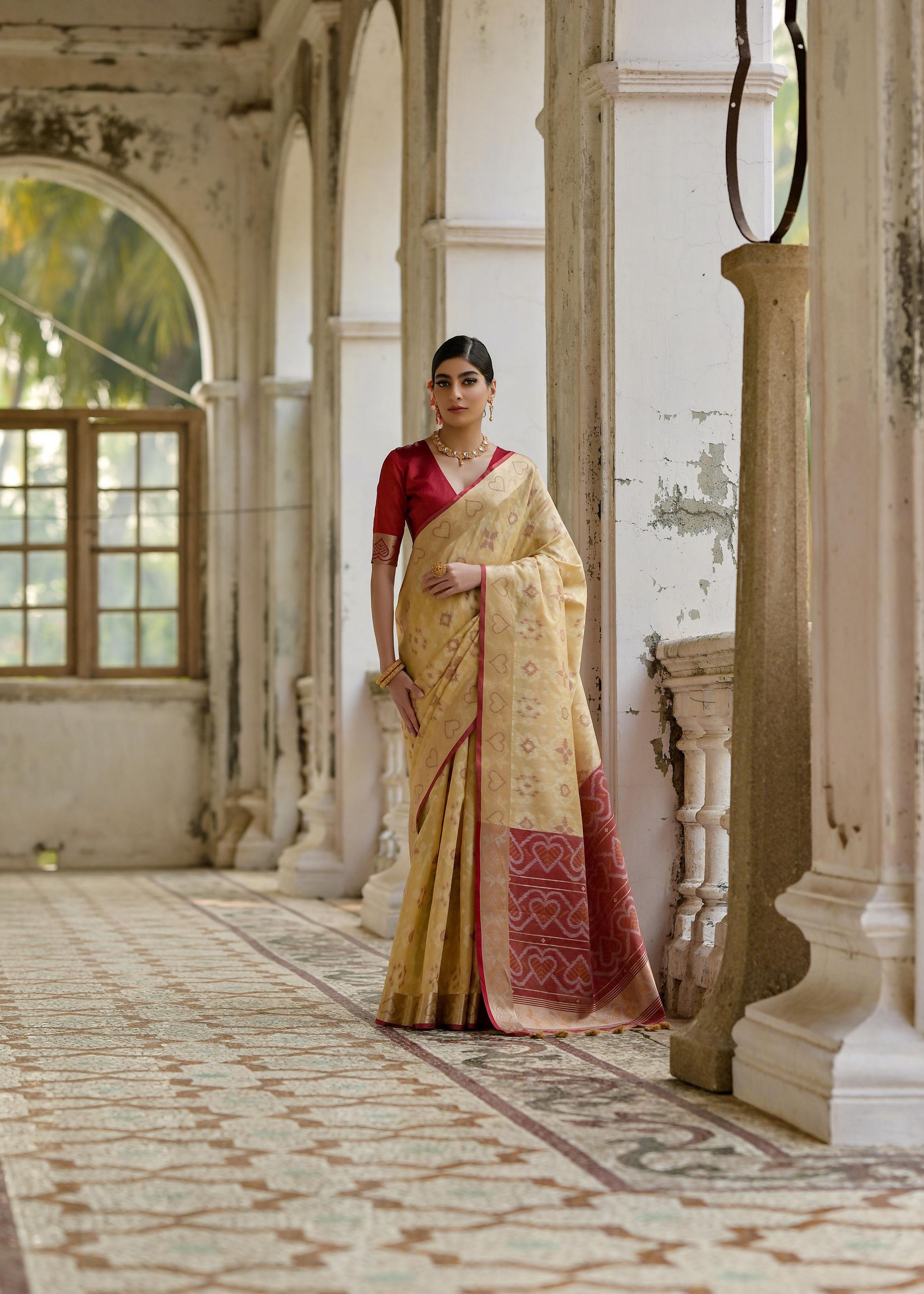 Beige Raw Silk Woven Ikat Designer Ceremonial Saree