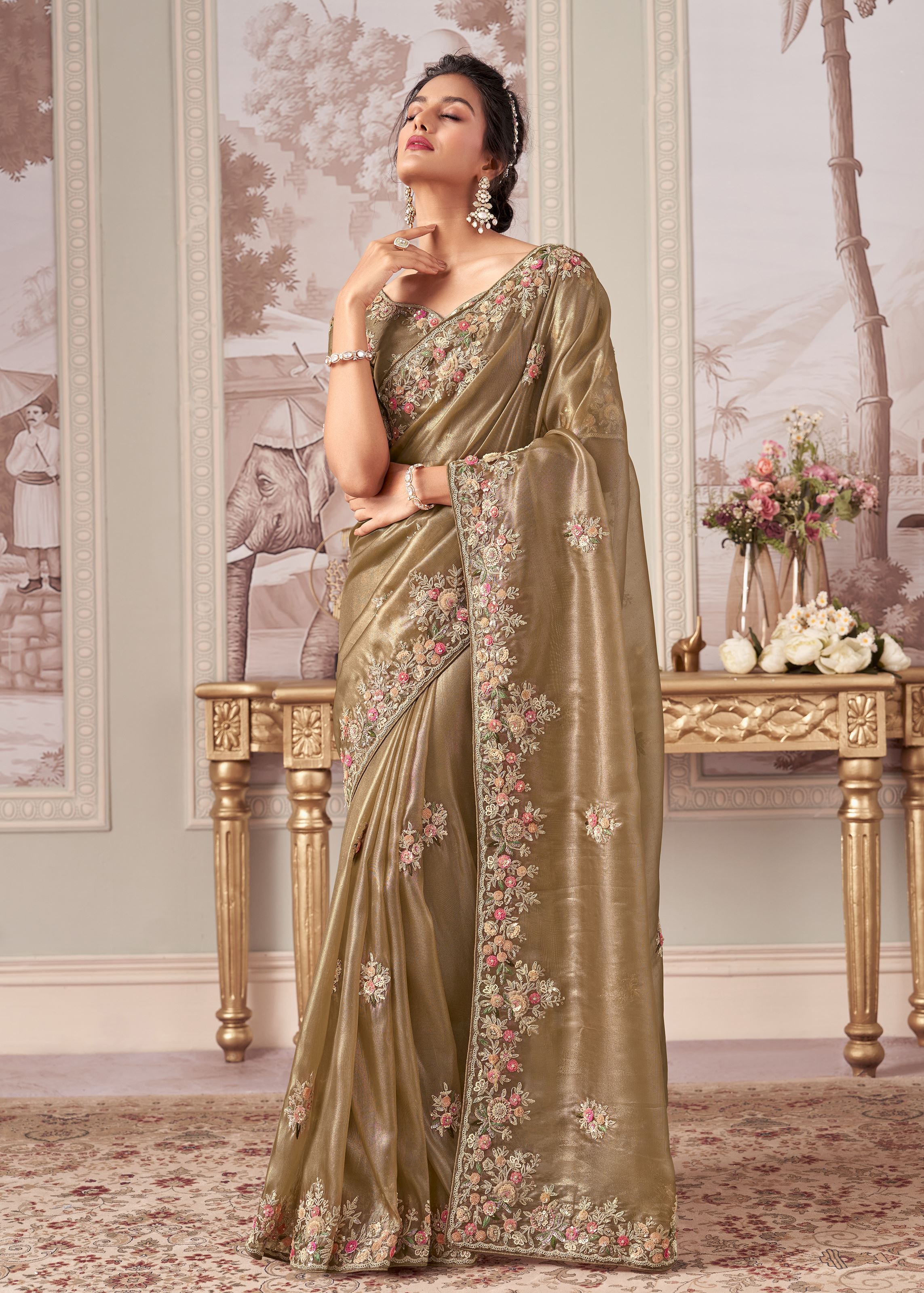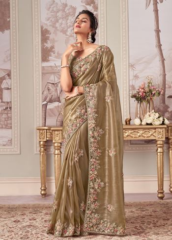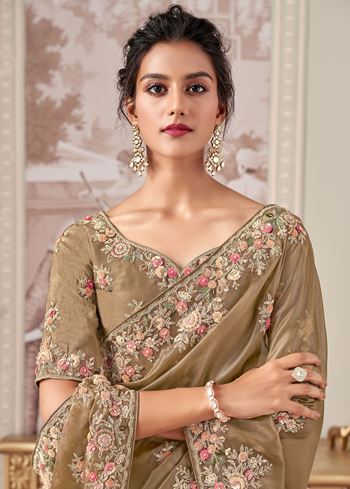 The neutral beige hue adds a touch of understated grace, while the heavy thread embroidery, shimmering zari, and sequins work transform the saree into a canvas of exquisite detailing. Each element is thoughtfully placed to enhance the fabric’s elegance, offering a look that is both classic and contemporary.