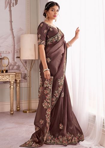 Accompanied by a matching Rayna silk blouse in beige with complementary embroidery, the set ensures a cohesive and polished ensemble. Whether you style it for a day function or an evening affair, this saree guarantees effortless sophistication.