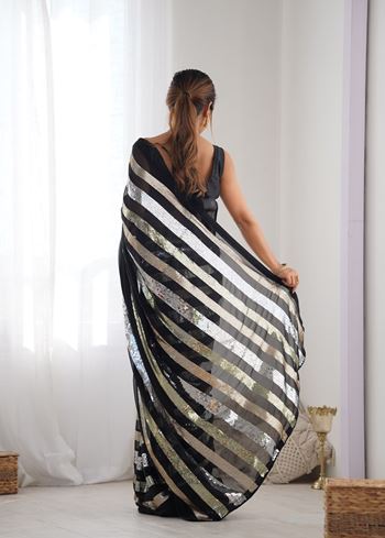 This designer saree combines contemporary style with traditional craftsmanship, providing a lightweight, flowing drape that ensures comfort while maintaining a graceful silhouette. Ideal for grand occasions, parties, and ceremonies, the classic black shade paired with sparkling sequins creates a timeless and captivating appearance.