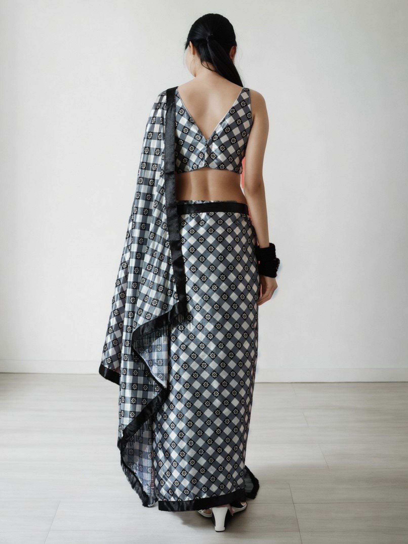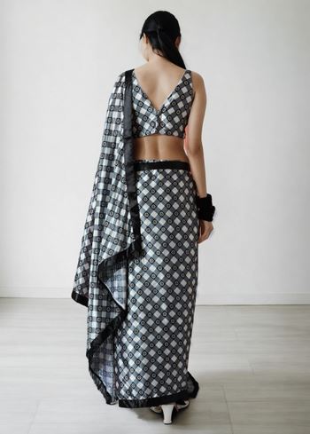 Black Chinnon Digital Print & Lace Border Trendy Ready-to-Wear Saree