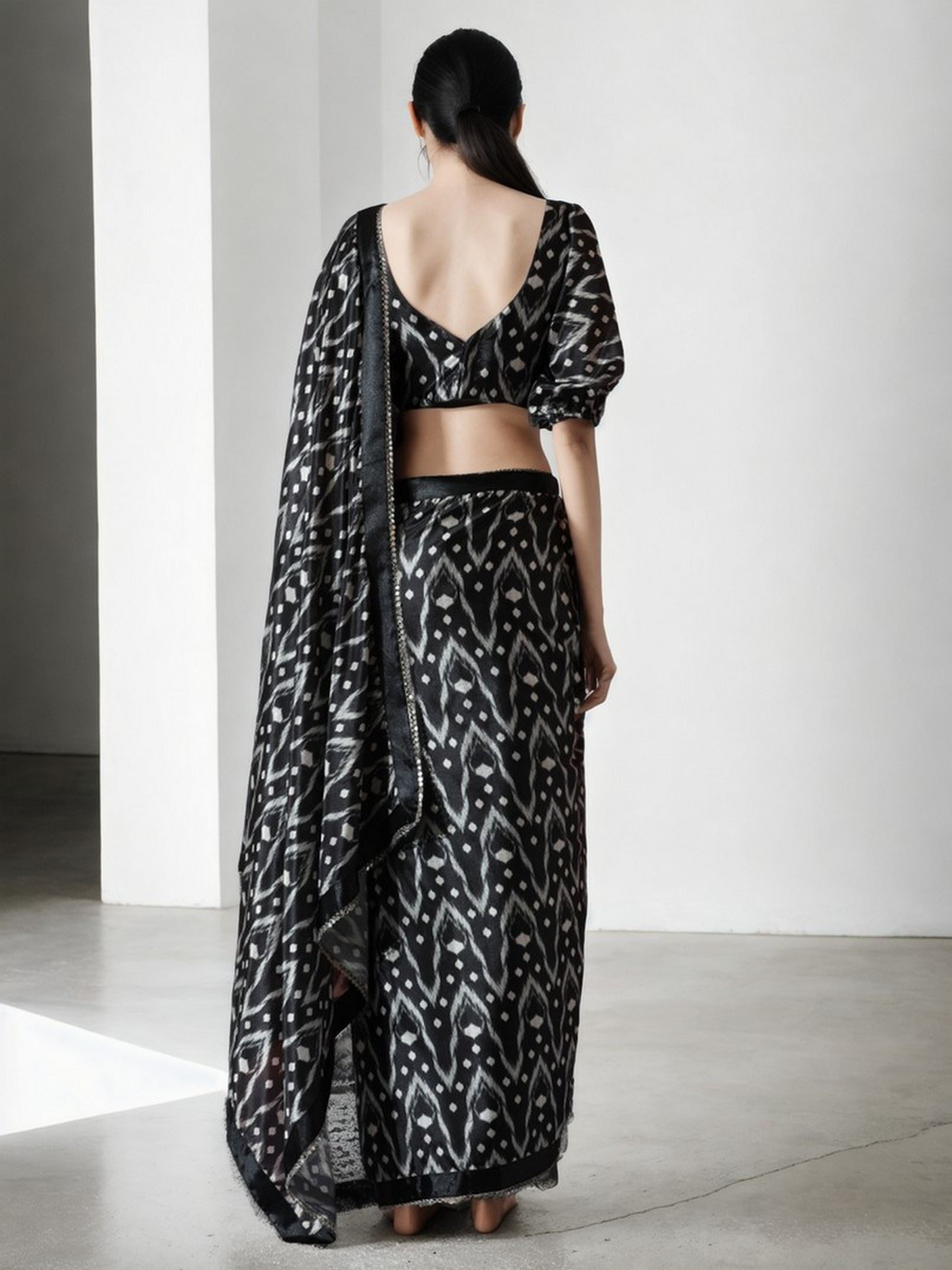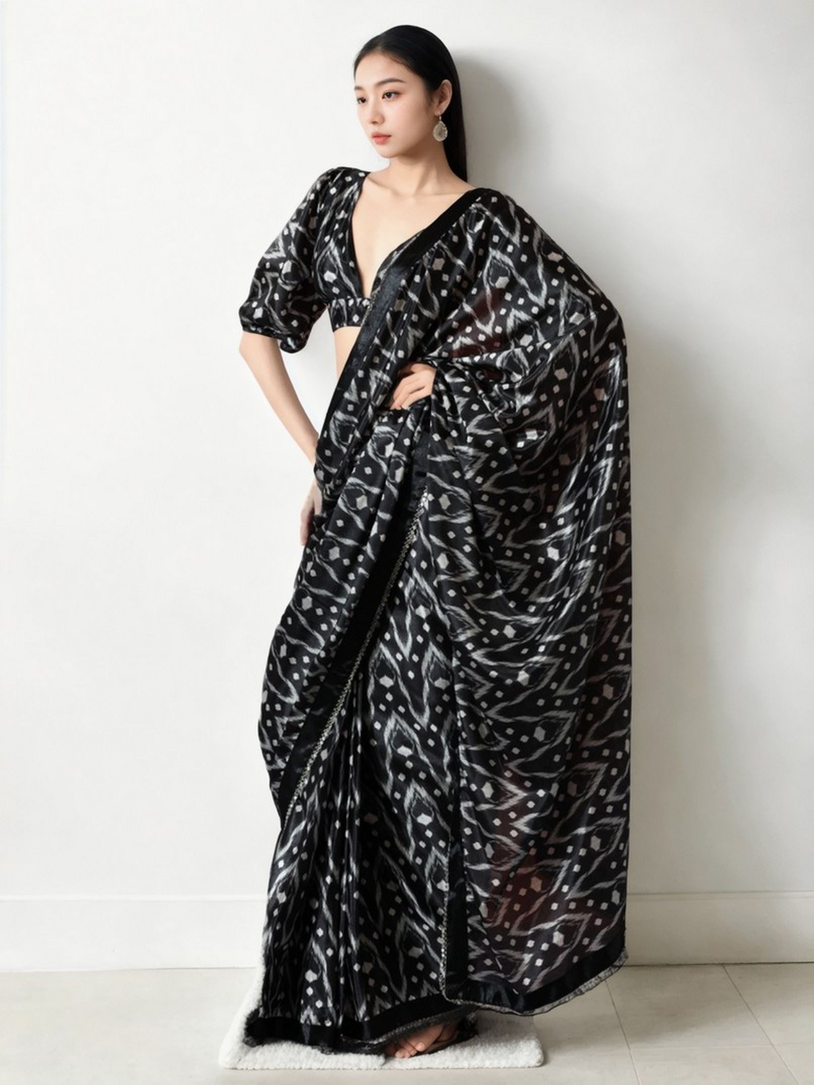 Black Chinon Designer Digital Printed Ready To Wear Saree