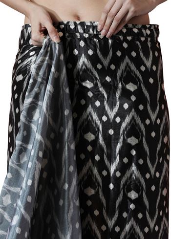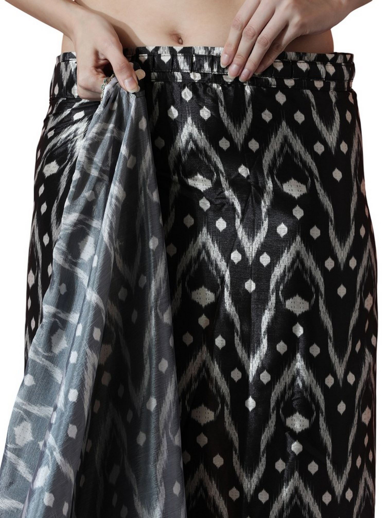 This ready-to-wear saree is designed for effortless styling and a flattering fit, paired with a matching black art silk blouse to complete a cohesive, elegant ensemble. Lightweight and luxurious, it allows comfortable movement without compromising on glamour, making it ideal for fashion-conscious women who value both style and convenience.