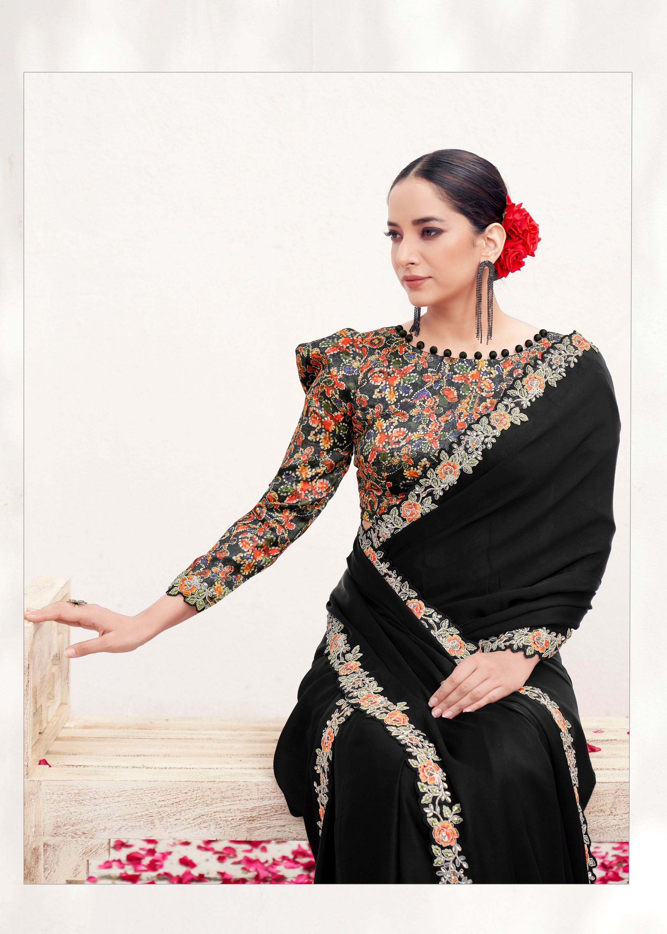 Made from luxurious crepe satin silk fabric, the saree drapes gracefully, giving you a sleek and elegant silhouette. The bold black color adds a touch of sophistication and timeless glamour, making it a perfect choice for evening functions and grand celebrations. The saree features heavy embroidery work, meticulously crafted to create a royal and opulent look that exudes elegance.
