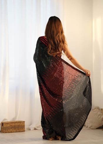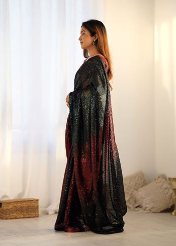 Paired with a matching black art silk blouse, this saree ensures a coordinated and elegant look. The soft and drapable georgette fabric allows effortless styling while providing all-day comfort. Accessorize with statement jewelry, heels, and a chic clutch to create a standout ensemble that captures attention at any party. Designed for women who appreciate contemporary ethnic wear with a glamorous twist, this saree effortlessly blends tradition with modern design.