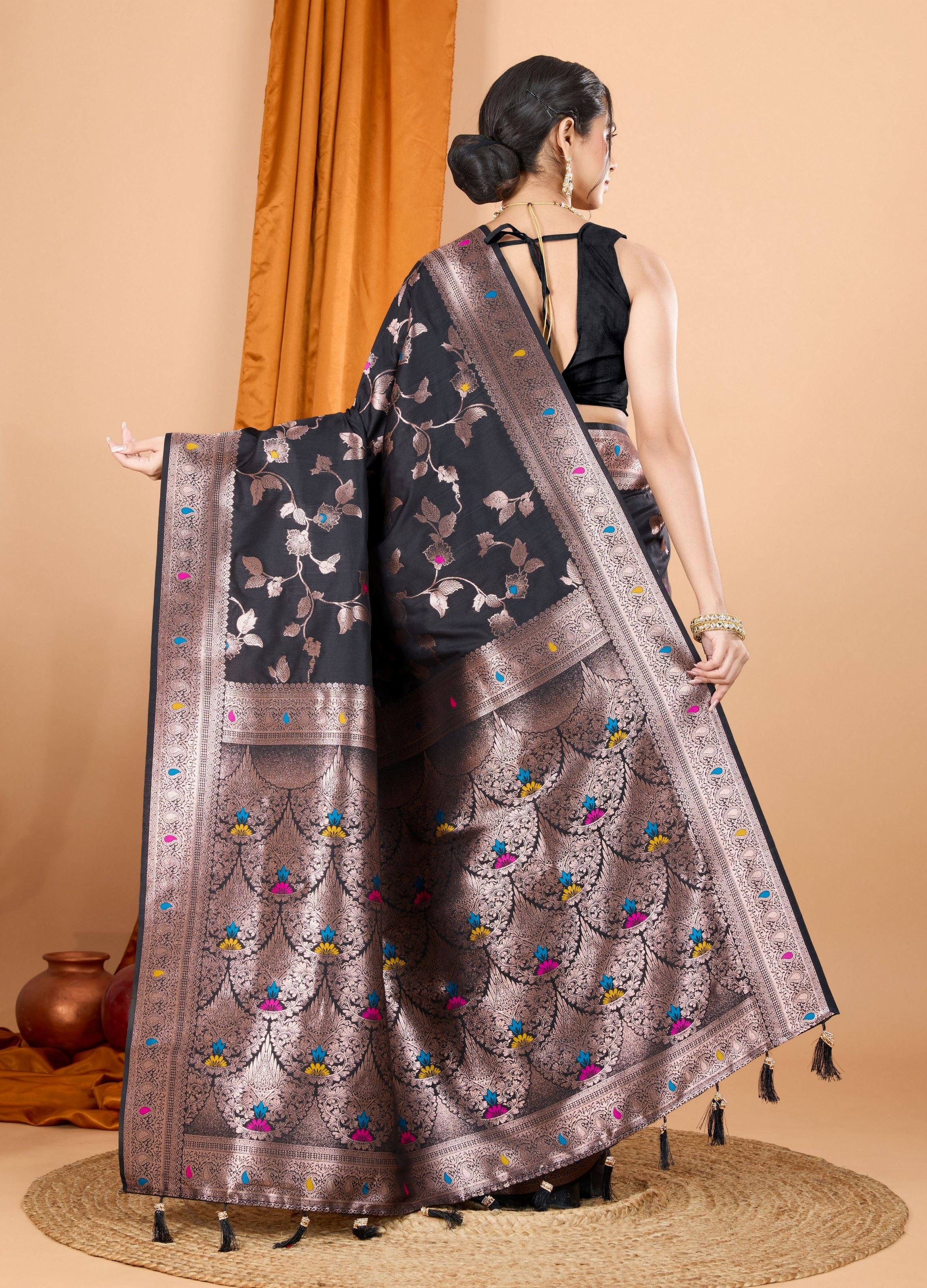 Black Ethnic Banarasi Silk Saree With Woven Jari Designer Work
