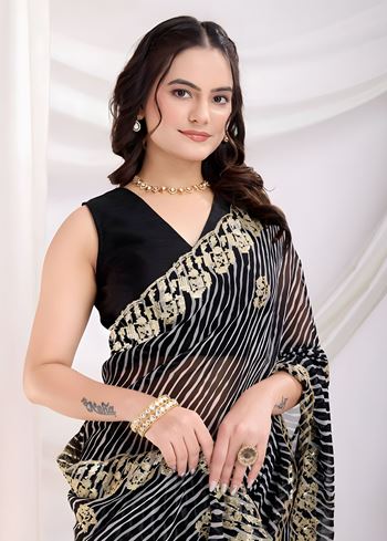 Channel timeless elegance with a modern twist in Aethnofit Fashions’ Black Georgette Saree, beautifully detailed with contemporary digital prints and subtle sequins. The rich black base sets the tone for effortless sophistication—perfect for evening soirees, cocktail events, or festive celebrations that call for a statement ensemble.