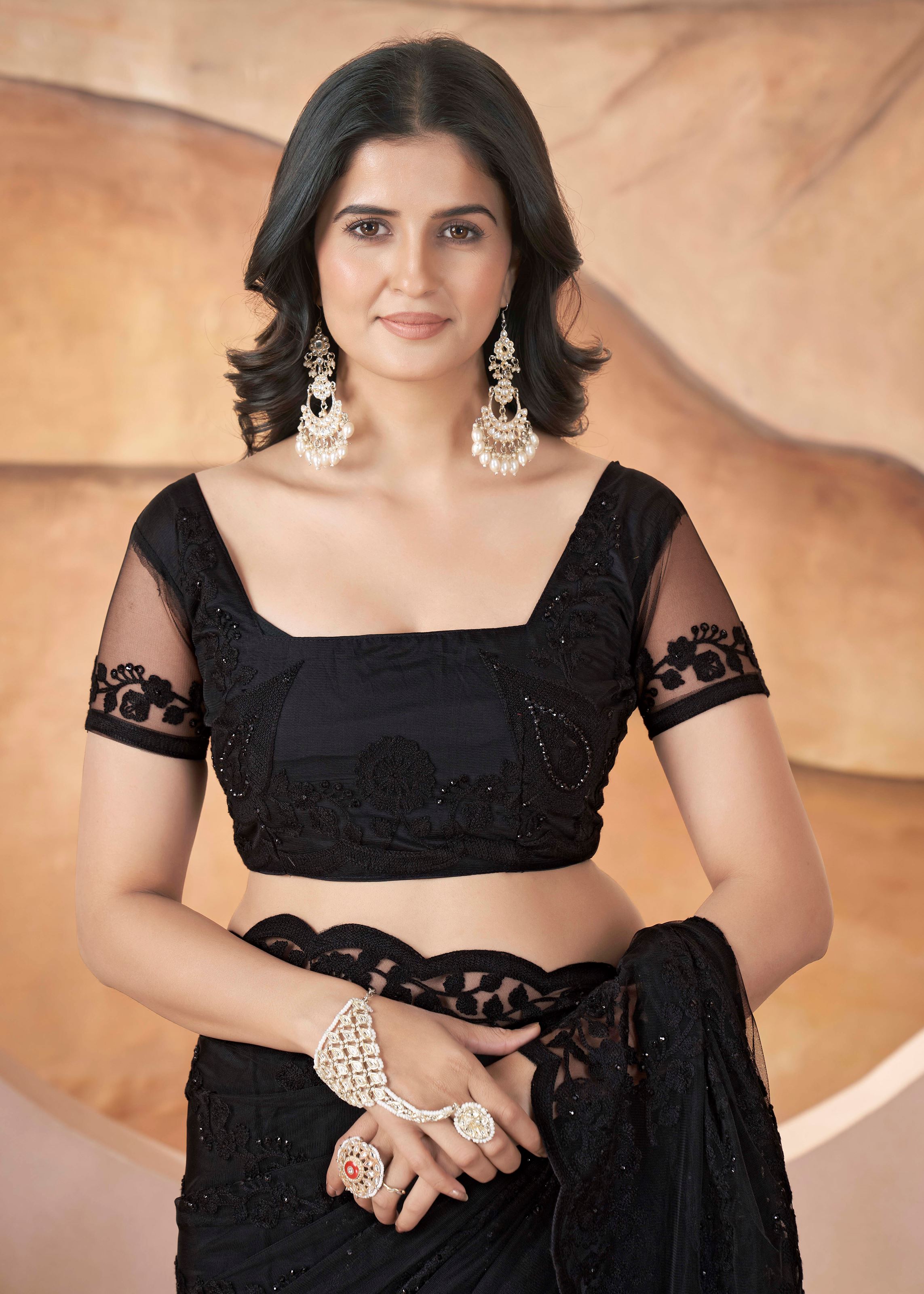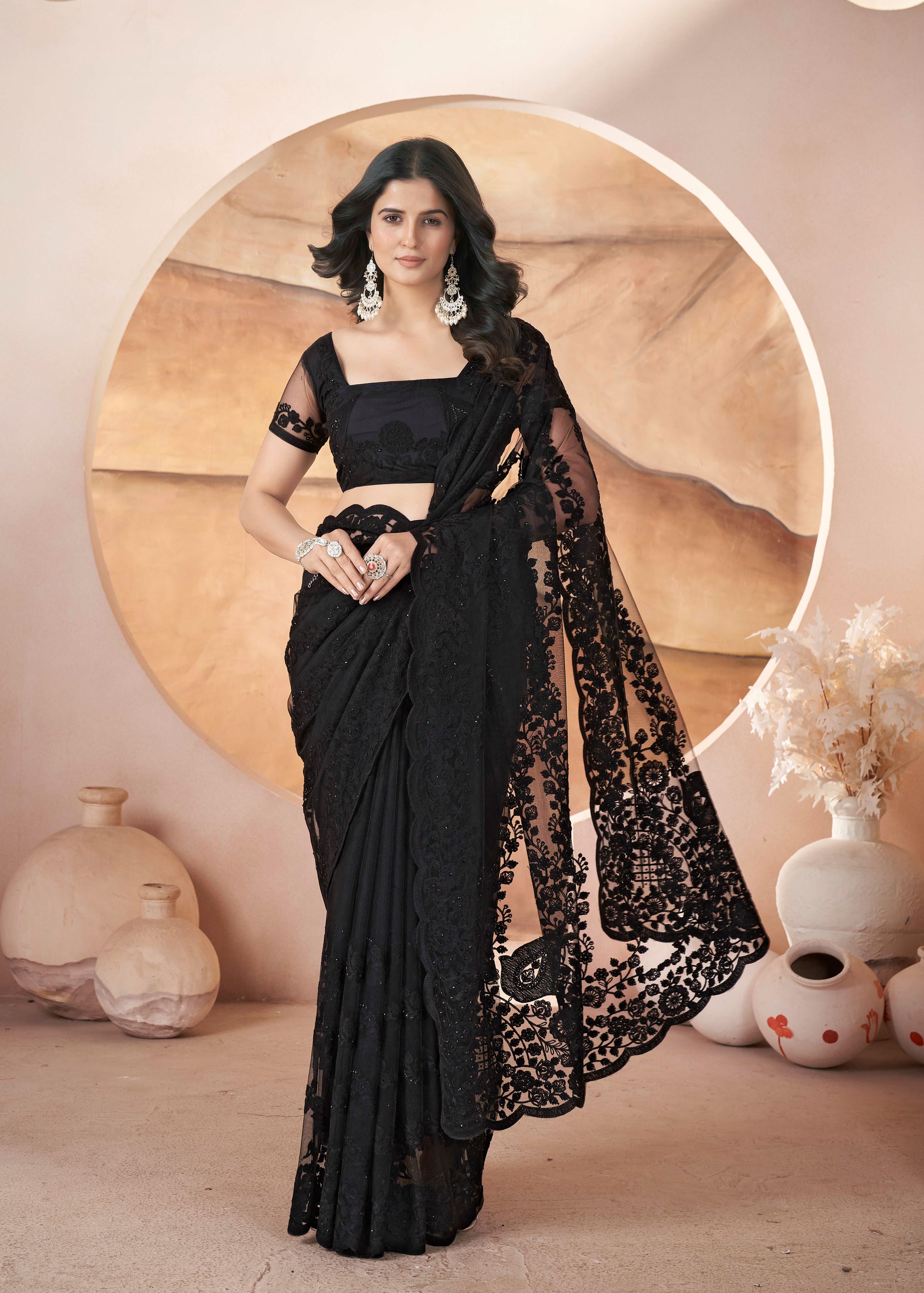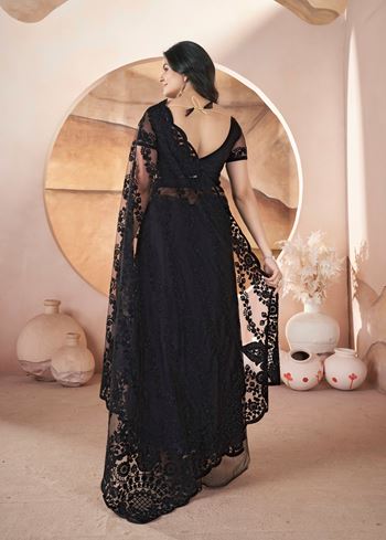 The saree comes with a perfectly matching black net blouse, creating a sleek and coordinated look. Every embroidered detail showcases exceptional craftsmanship, giving this saree a luxurious appeal. Whether you want a glamorous Bollywood-inspired outfit or a timeless ethnic piece, this saree fits every occasion.