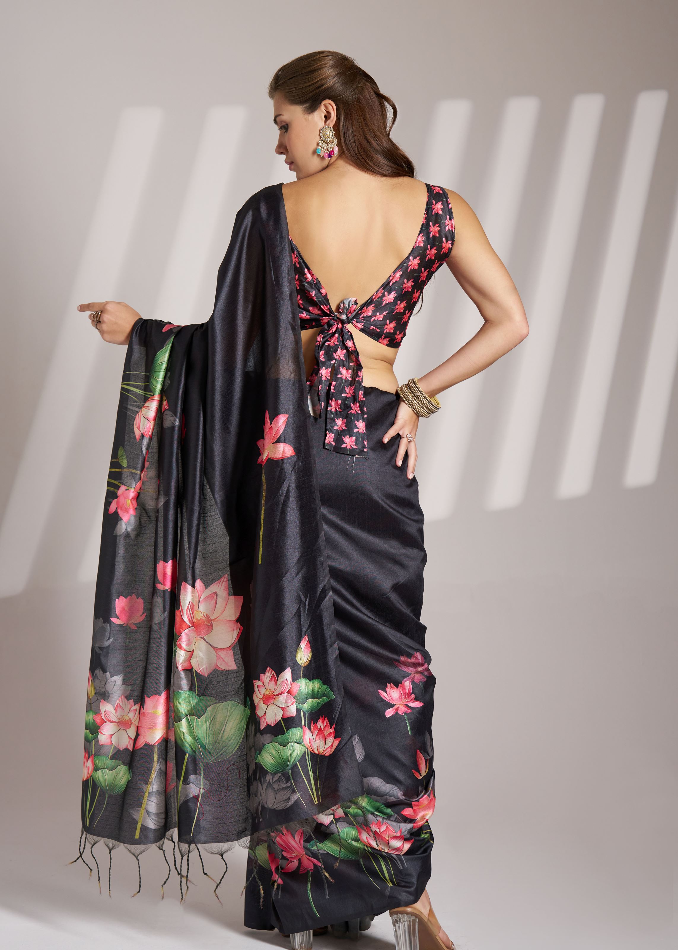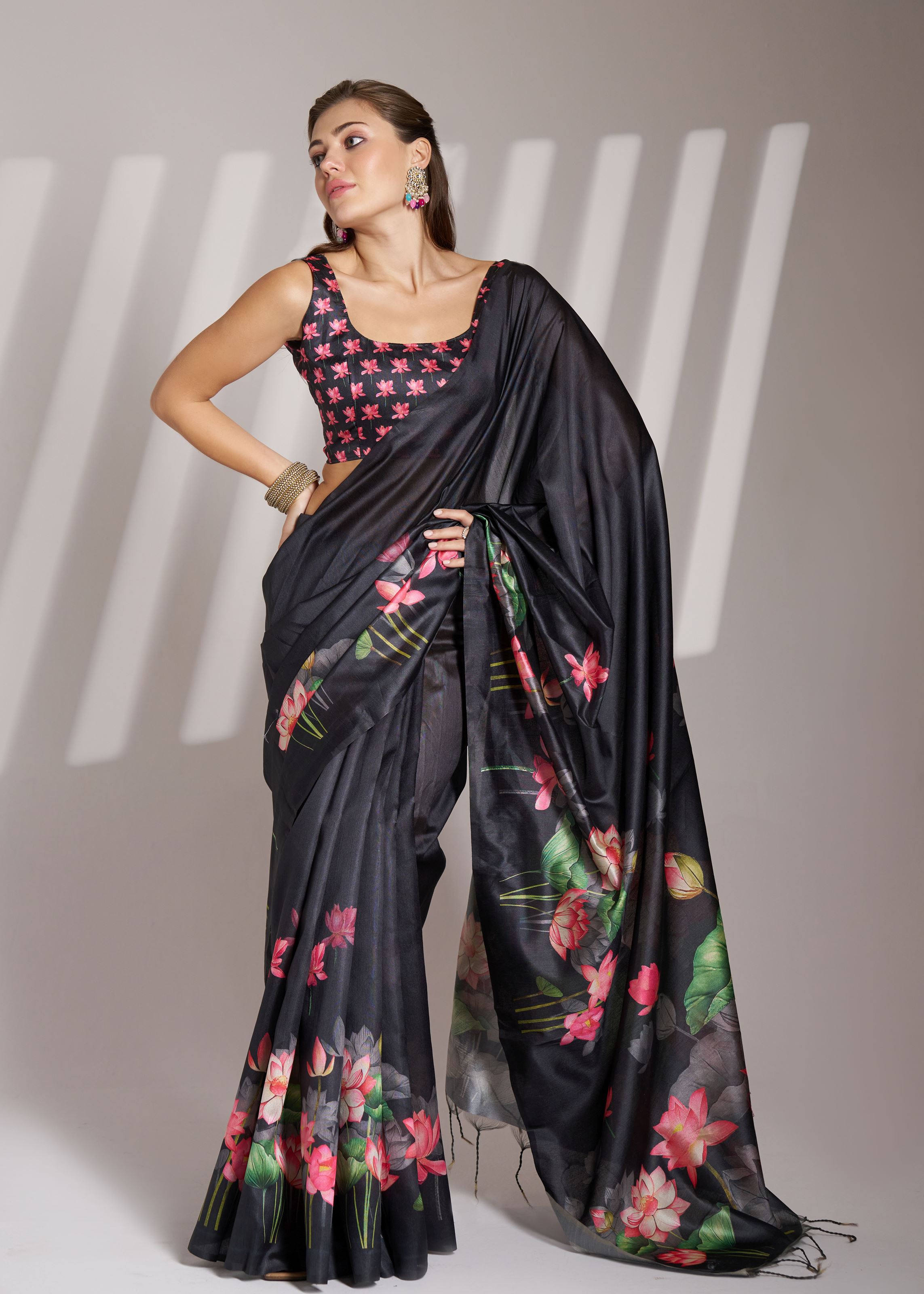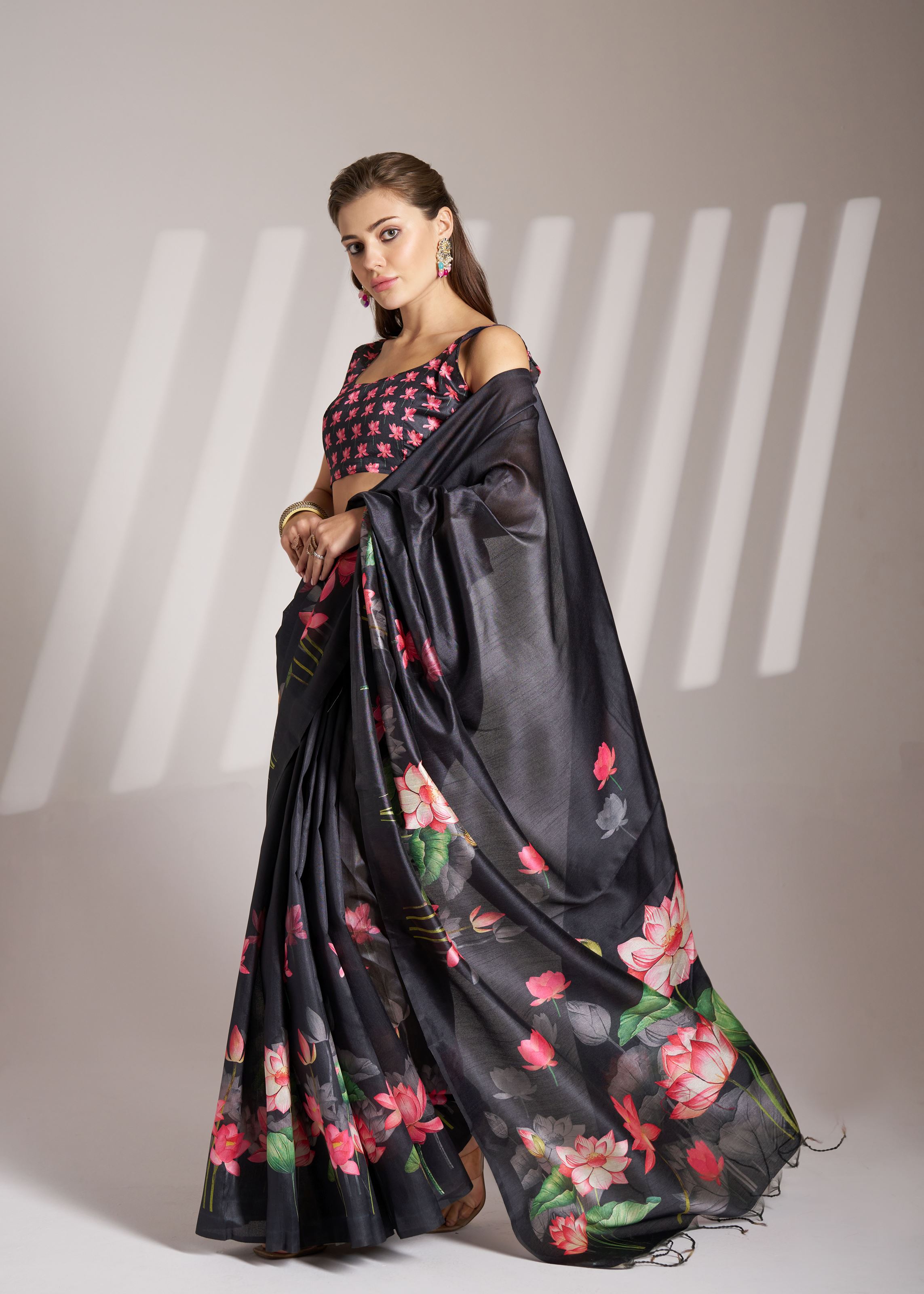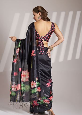 Crafted from premium-quality linen fabric, the saree offers a breathable yet structured drape that enhances your silhouette with effortless charm. The deep black shade exudes elegance, while the printed detailing adds a fashionable touch, making it versatile enough for festive gatherings, cocktail evenings, wedding receptions, or cultural celebrations.