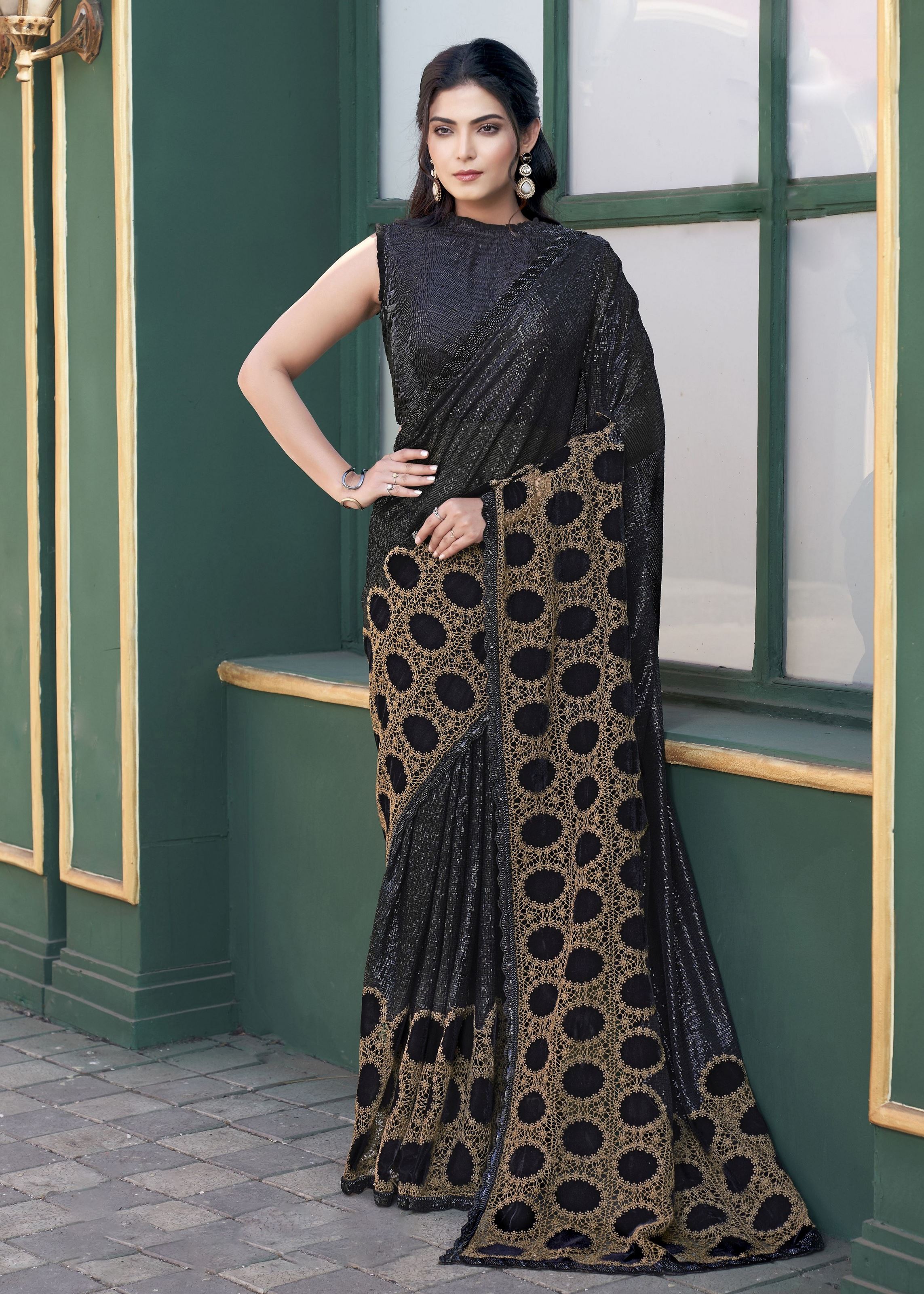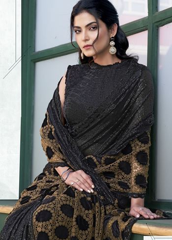 Make an everlasting impression with the Black Gucci Velvet Designer Sequence Embroidery With Hand Beads Stone Work Wedding Season Saree, a luxurious creation that exudes elegance and grandeur. Crafted in premium velvet fabric, this saree showcases a rich black hue that reflects sophistication and timeless beauty. The lavish sequence embroidery, embellished with hand beads and stone work, gives it a regal charm, making it the perfect attire for weddings, receptions, and festive celebrations.