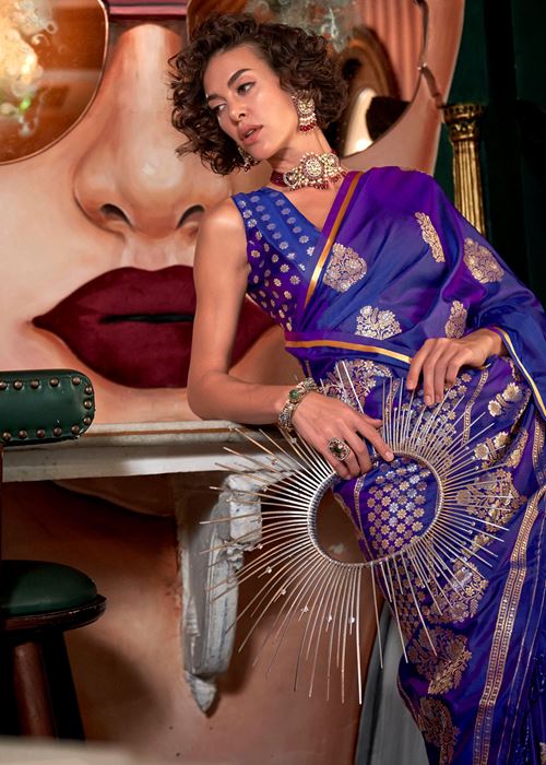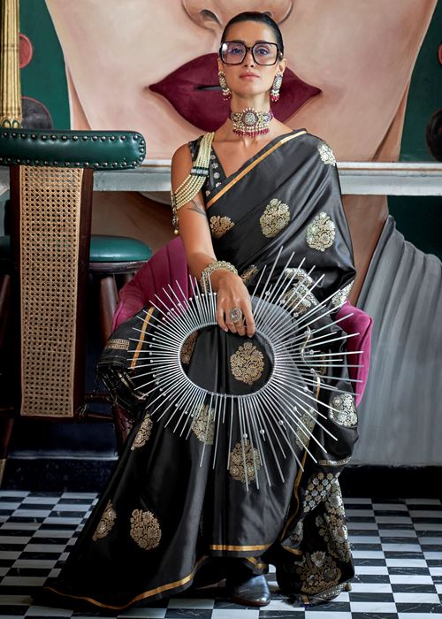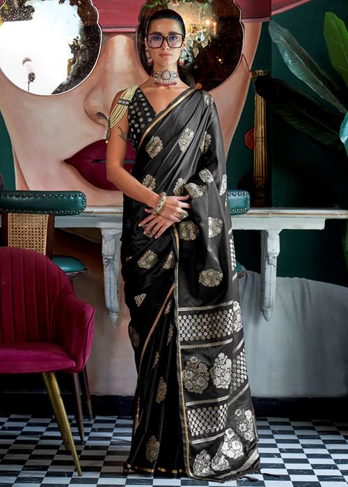 Black Handloom Satin Saree With Jacquard Satin Handloom Woven Work