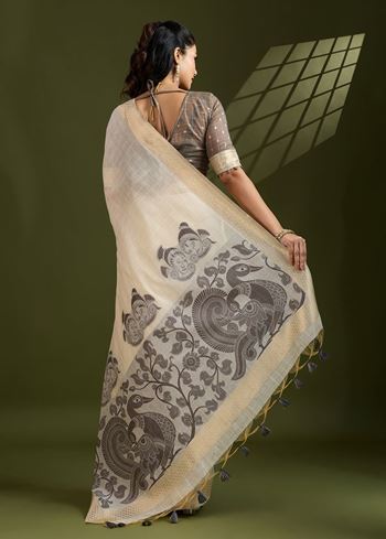 The cream base exudes a timeless charm, ideal for formal functions, festive gatherings, or casual celebrations. The contrast black blouse, made from the same breathable Muga cotton, enhances the saree’s overall appeal while keeping the look rooted and refined. The signature Kalamkari pallu steals the spotlight with its hand-drawn motifs and storytelling design—offering a canvas of heritage with every drape.