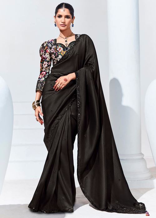 Black Organza Saree With Thread Embroidery with Printed Blouse