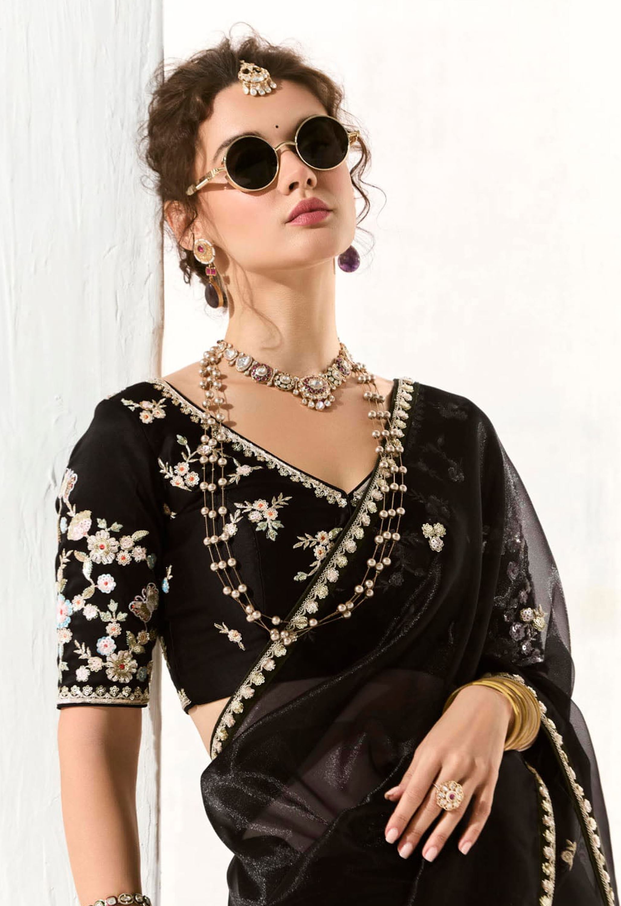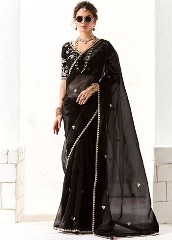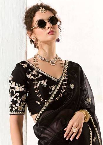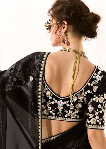 Accompanying the saree is a matching black organza tissue blouse, thoughtfully embroidered to complement the saree’s ornate design. The blouse’s craftsmanship enhances the ensemble’s sophistication, making it an ideal pick for fashion enthusiasts seeking designer sarees online with rich detailing and elegance.