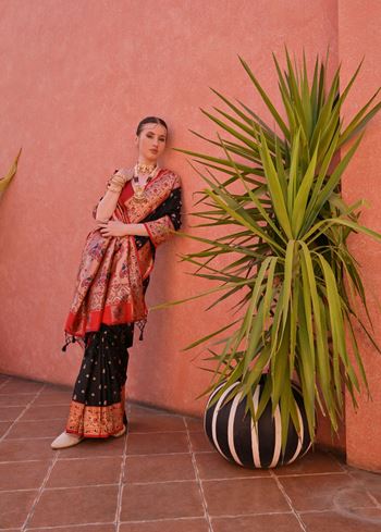 The pièce de résistance is its exquisite Paithani pallu, adorned with classic motifs and lavish zari detailing, evoking the legacy of Maharashtrian weaving traditions. The richness of black paired with golden accents creates a striking silhouette that exudes sophistication.