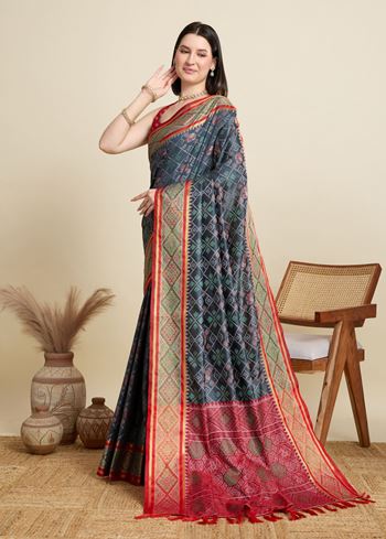 Make a grand style statement with the Black Patola Silk Woven Meenakari Designer Partywear Saree from Aethnofit Fashions. Designed with precision, this saree is crafted from a luxurious silk blend that offers a perfect mix of traditional artistry and modern elegance. The rich black hue, combined with exquisite woven Meenakari detailing, brings an aura of sophistication that is ideal for weddings, festive occasions, and exclusive parties.