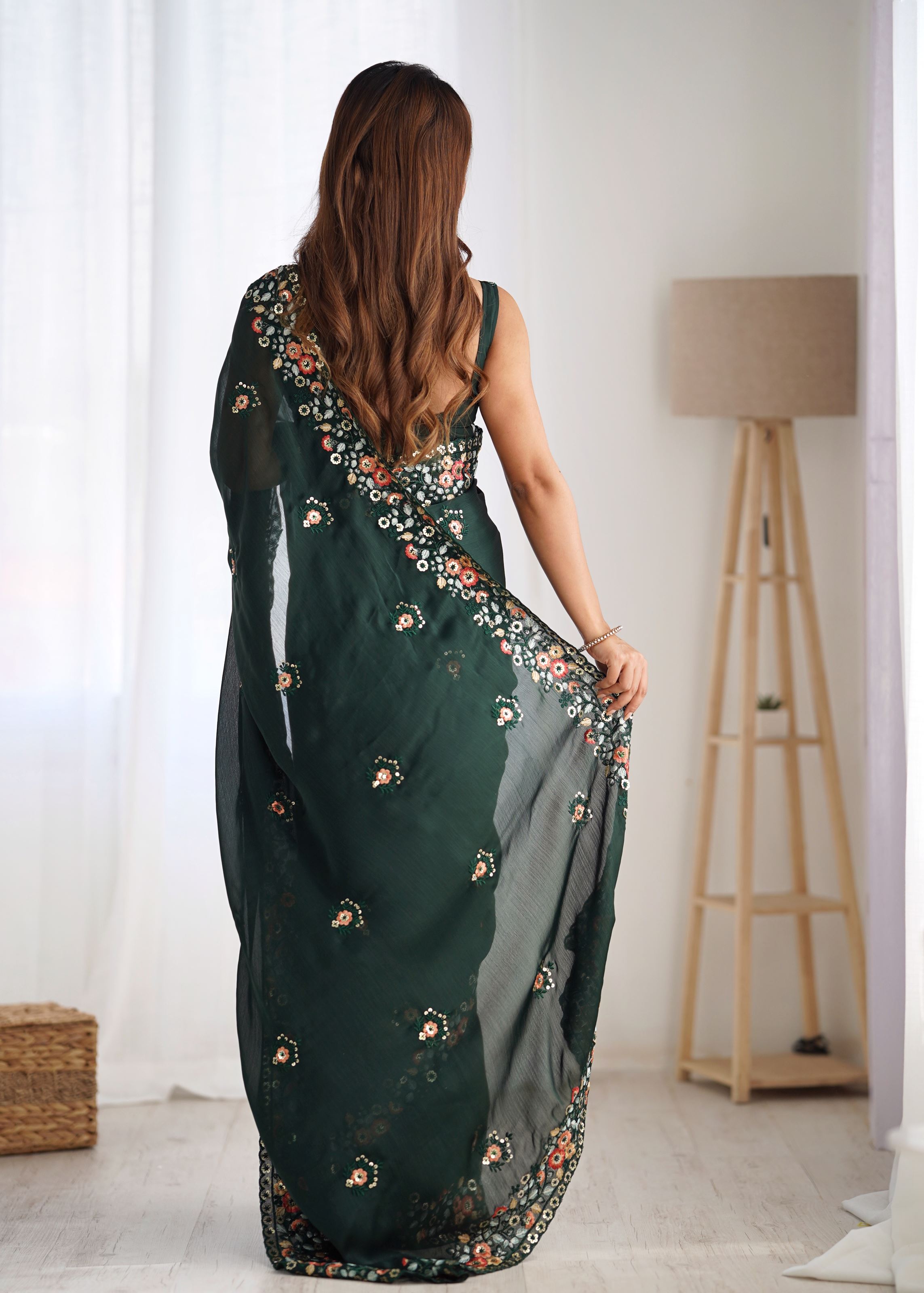 The saree is paired with a matching black chiffon blouse, beautifully embroidered to complement the sequins and thread detailing on the drape. Together, the blouse and saree create a seamless and coordinated look that reflects both tradition and modern designer flair. Lightweight yet stylish, this saree ensures you remain comfortable while exuding glamour at every occasion.