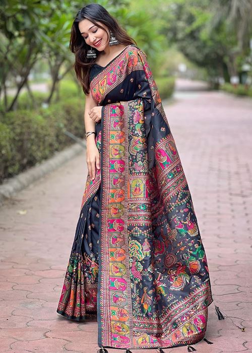 Black Silk Blend Pashmina Saree With Woven Work