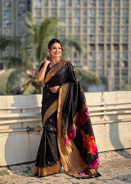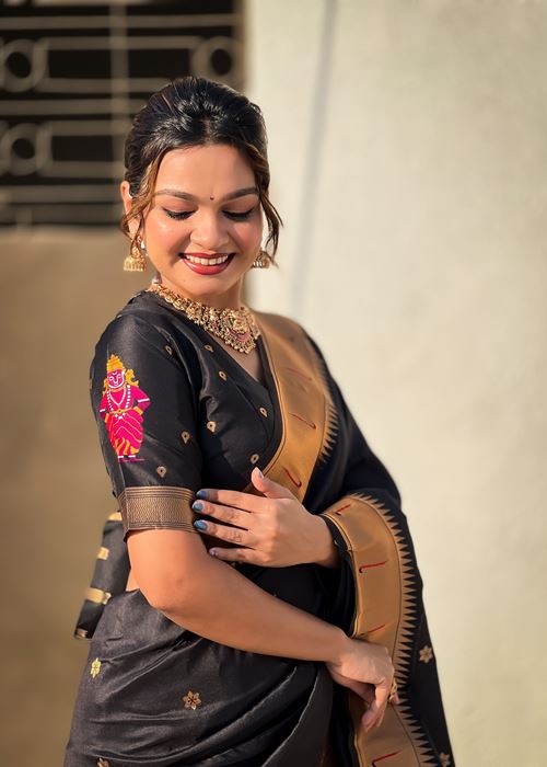 Black Silk Blend Vitthala God Paithani Silk Saree