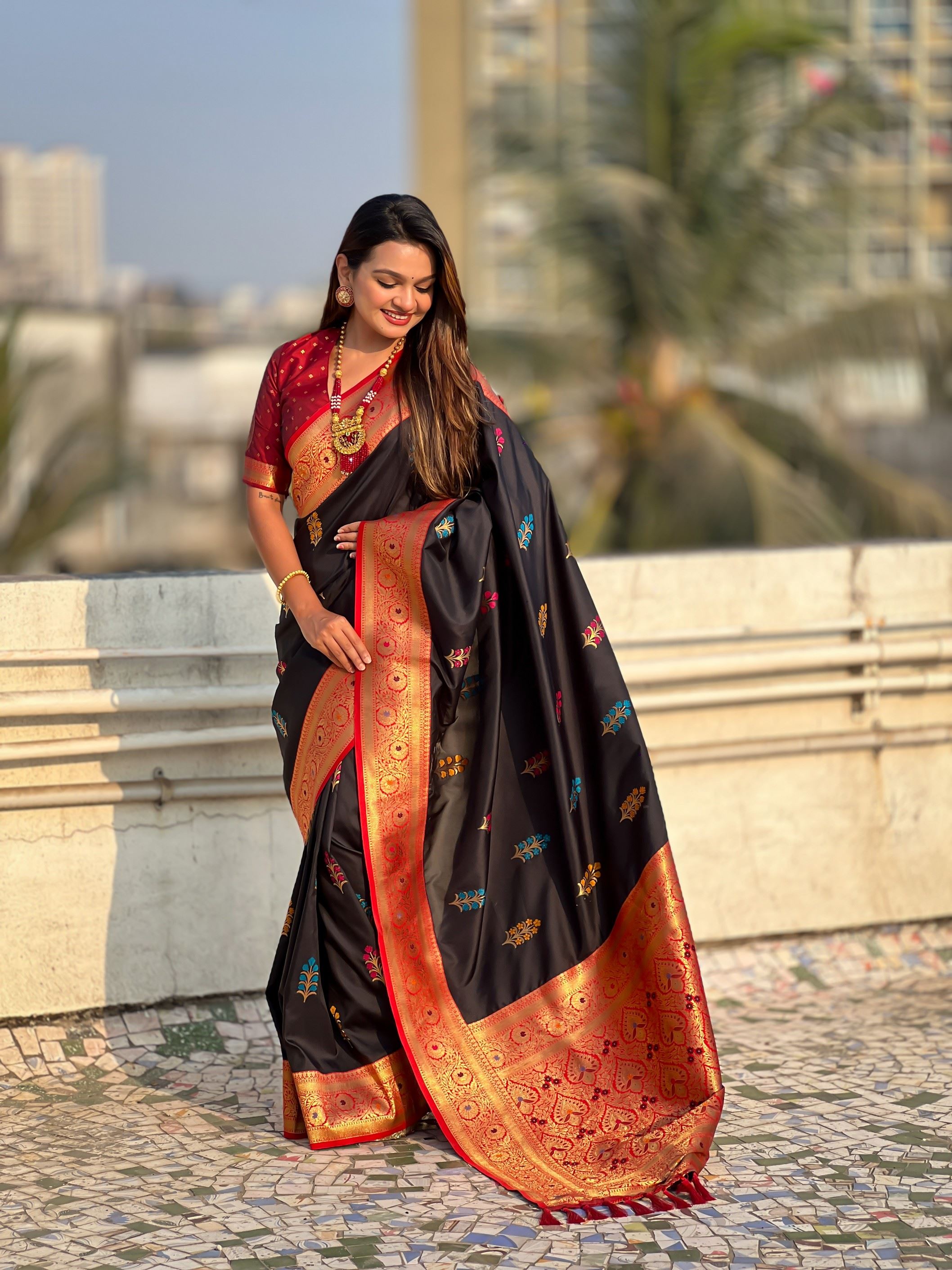 The woven craftsmanship reflects skilled artistry, giving the saree a heavy and luxurious appeal, while its soft silk fabric ensures graceful draping and comfort. Perfect for bridesmaids, festive gatherings, or ceremonial functions, this designer saree blends traditional weaving with contemporary elegance—ensuring you leave a lasting impression.Shop exclusive sarees at Aethnofit Fashions, where tradition meets trend. Explore our 2025 collection of premium ceremonial sarees—silk, organza, georgette, chiffon, and more—designed for weddings, parties, and festive occasions. This black Meenakari woven silk saree with red blouse is the ultimate ethnic statement piece, blending grace, heritage, and luxury in every drape.
