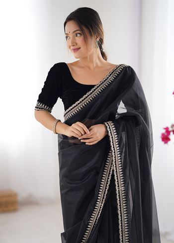 Style this saree with diamond or silver jewelry, bold eye makeup, and a sleek hairstyle to create a sophisticated, red-carpet-ready appearance. Its versatile design makes it suitable for cocktail parties, formal events, or any celebration where you want to stand out effortlessly.Upgrade your wardrobe with this glamorous black net saree, blending elegance with contemporary chic to make every occasion unforgettable.