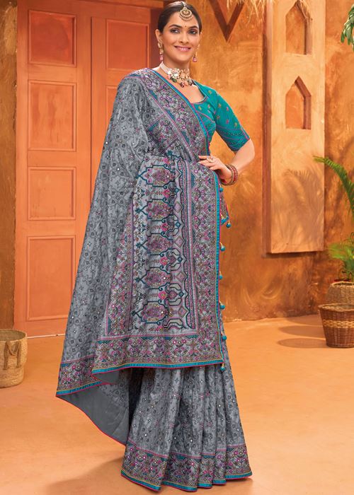 Blue Banarasi Silk Saree With Pure kacchi, Diamond and Mirror Work