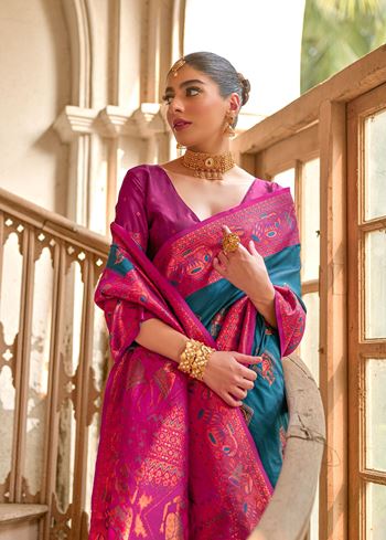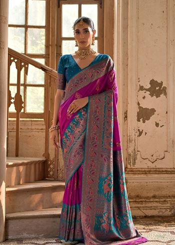 Unveil a perfect blend of tradition and artistry with this Blue Banarasi Silk Saree with Kalamkari Zari Design from Aethnofit Fashions. Crafted in luxurious Banarasi silk, this saree showcases a rich blue hue intricately adorned with Kalamkari-inspired zari motifs that add storytelling charm and cultural depth. The wine-colored Banarasi silk blouse offers a striking contrast, adding elegance and richness to this graceful ensemble.