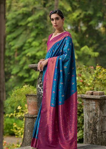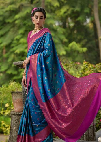 Blue Banarasi Silk Saree with Leaf Design and Contrast Pallu