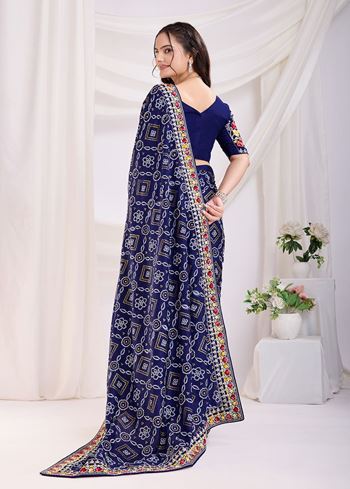 Blue Bandhani Printed with Embroidery Work Beautiful Ceremonial Saree