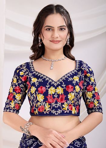 The saree features classic Bandhani prints, a centuries-old art form known for its vibrant dotted patterns that represent heritage and culture. To enhance its festive aura, the saree is delicately embellished with intricate embroidery work, adding a refined sparkle that elevates its overall appeal. It comes paired with a matching blue art silk blouse, completing the ensemble with harmony and grace.
