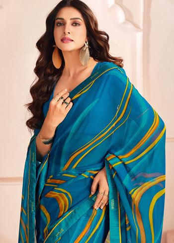 The rich blue hue symbolizes sophistication and serenity, while the digital printed design adds a refreshing modern twist. The prints are sharp, vibrant, and detailed, bringing a fashionable edge to this traditional attire. The saree comes with a matching blue faux georgette blouse, creating a seamless and graceful ensemble that radiates elegance.