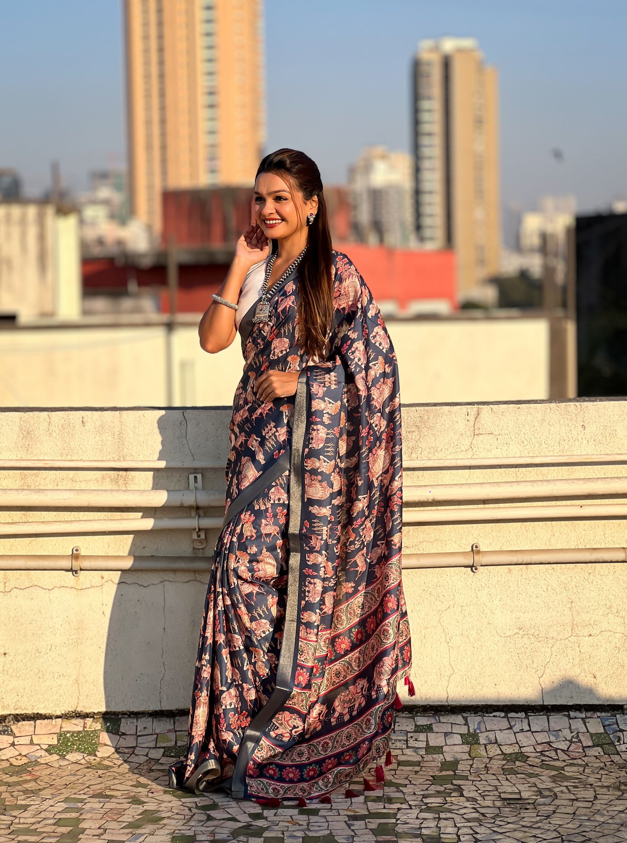 Paired with a matching blue silk blouse, this saree ensures a polished and coordinated appearance. The lightweight and soft tussar silk fabric allows for graceful draping while maintaining all-day comfort. Complete the look with statement jewelry, elegant heels, and ethnic accessories to create a festive-ready outfit that captures attention. Designed for women who value authentic silk craftsmanship, this saree perfectly balances elegance, tradition, and contemporary style.