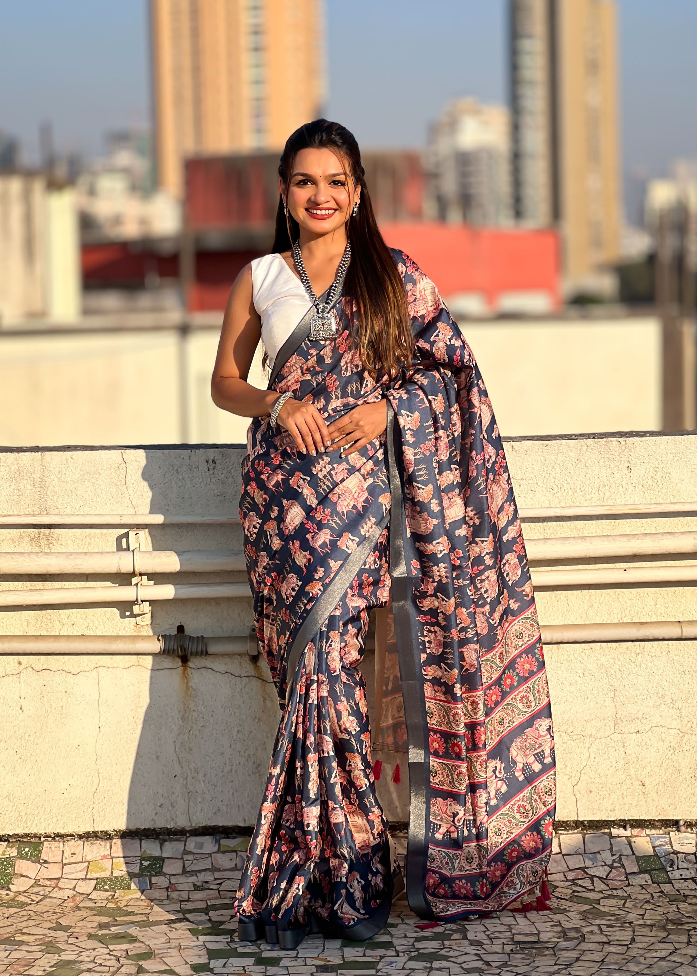 Blue Classic Tussar Silk Saree With Woven And Designer Print Work