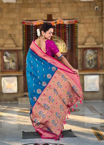 The elegant blue shade paired with intricate Paithani-style woven Jacquard work creates an exquisite appeal that reflects the rich heritage of traditional weaving. The contrasting pink silk blend blouse adds a vibrant twist, making this ensemble a true statement piece for any grand occasion.