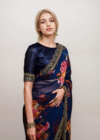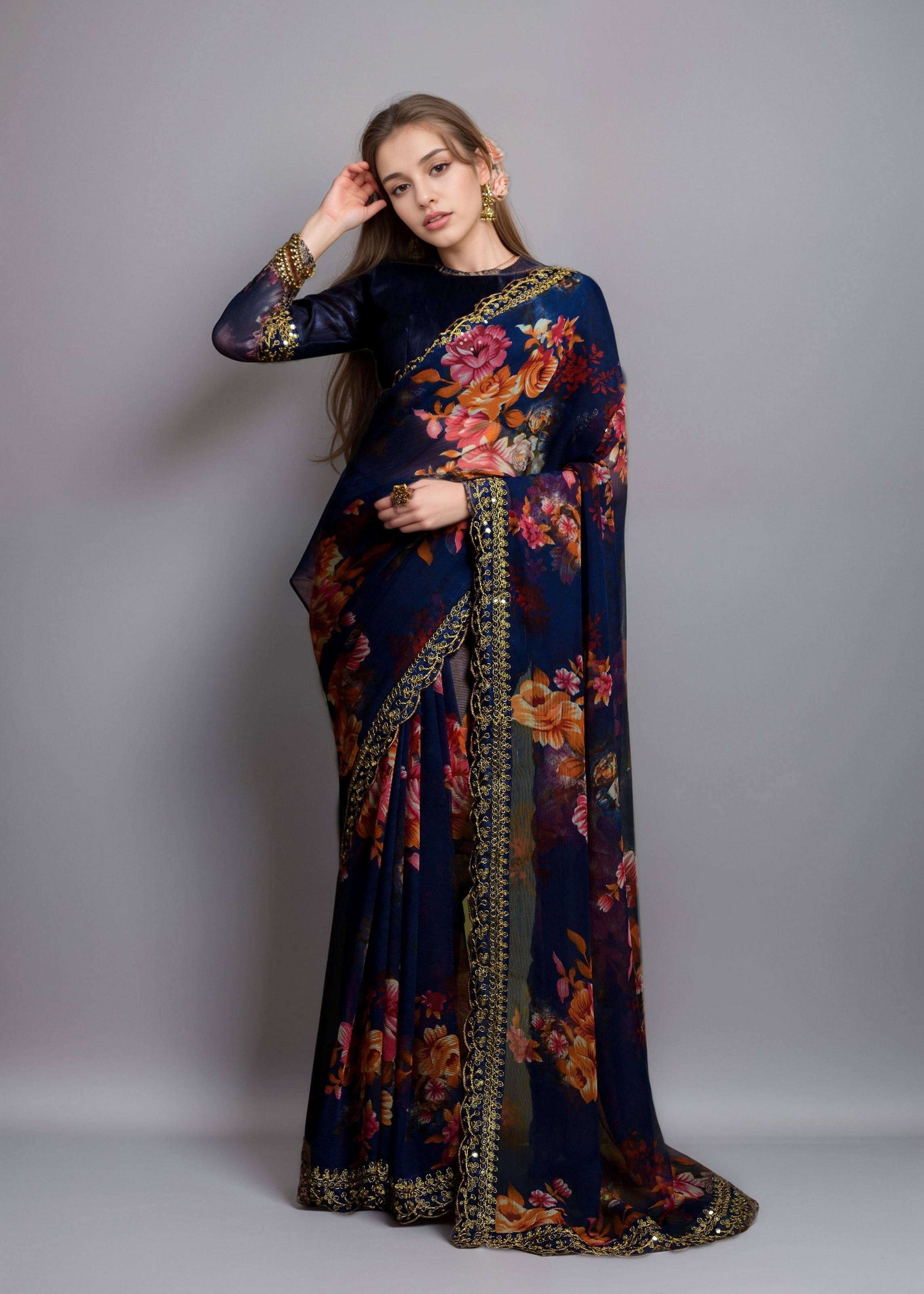 Blue Georgette Floral Printed With Embroidered Border Saree