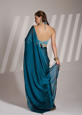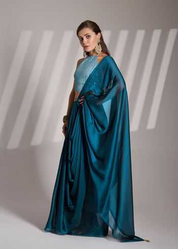 Paired with a sky blue art silk blouse, the ensemble creates a harmonious and stylish contrast. The blouse’s lustrous texture complements the luxurious satin fabric, delivering a flawless look suitable for Bollywood-inspired partywear sarees, bridal events, or evening celebrations. This saree embodies both glamour and elegance, perfect for women who love trendy ethnic fashion and designer pieces.
