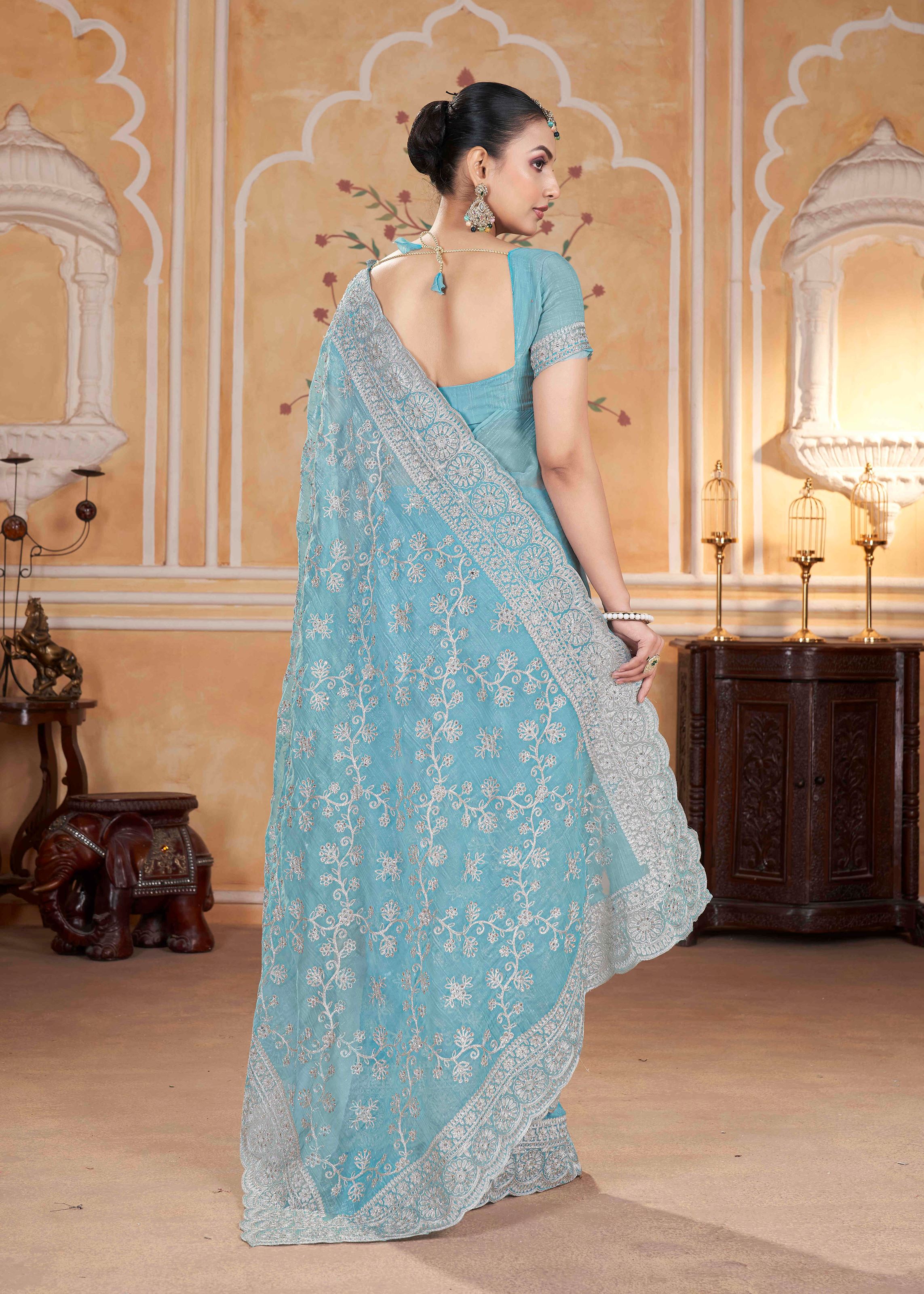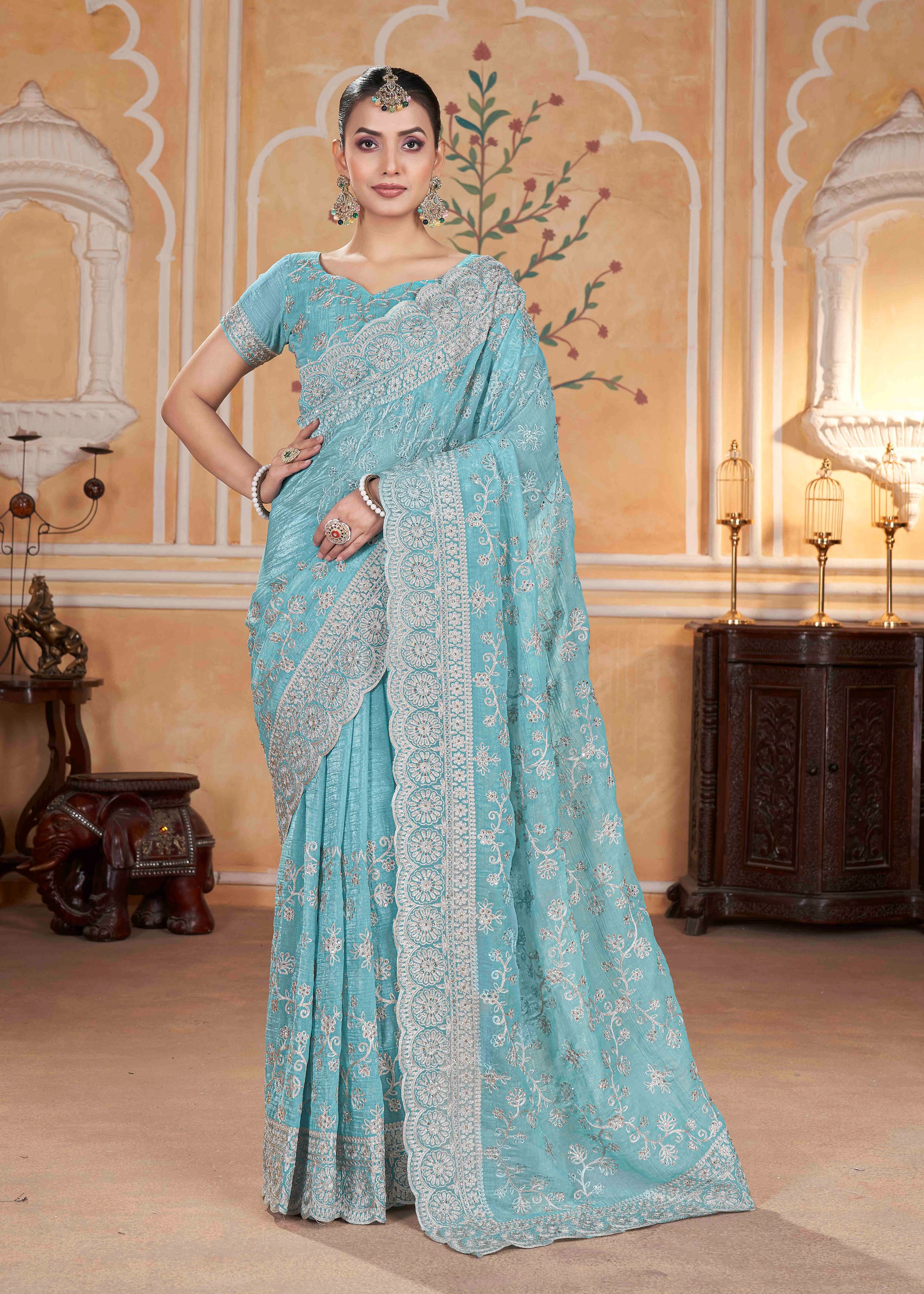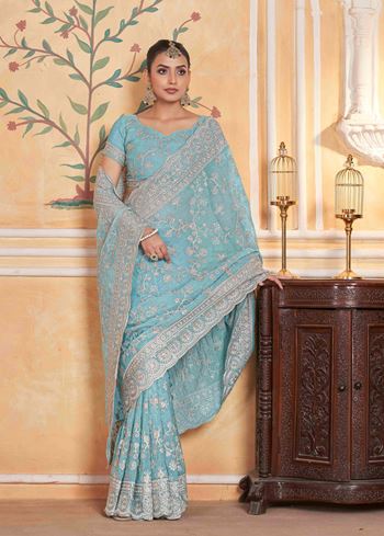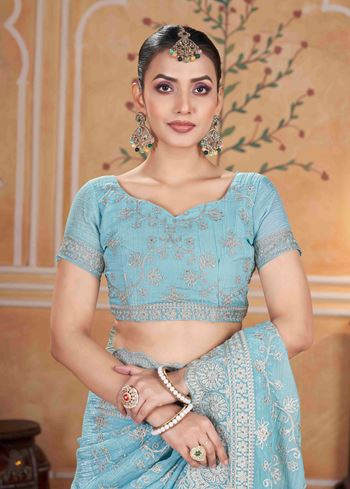 The saree comes with a matching blue chiffon blouse, ensuring a coordinated and classy appeal. Its detailed craftsmanship and rich embellishments make it a true statement piece for your ethnic wardrobe. Perfect for ceremonial events and Bollywood-inspired looks, this designer saree offers unmatched elegance and timeless beauty.