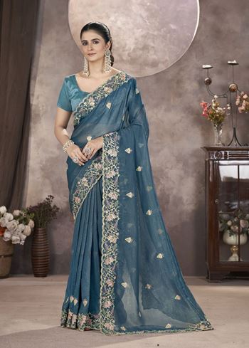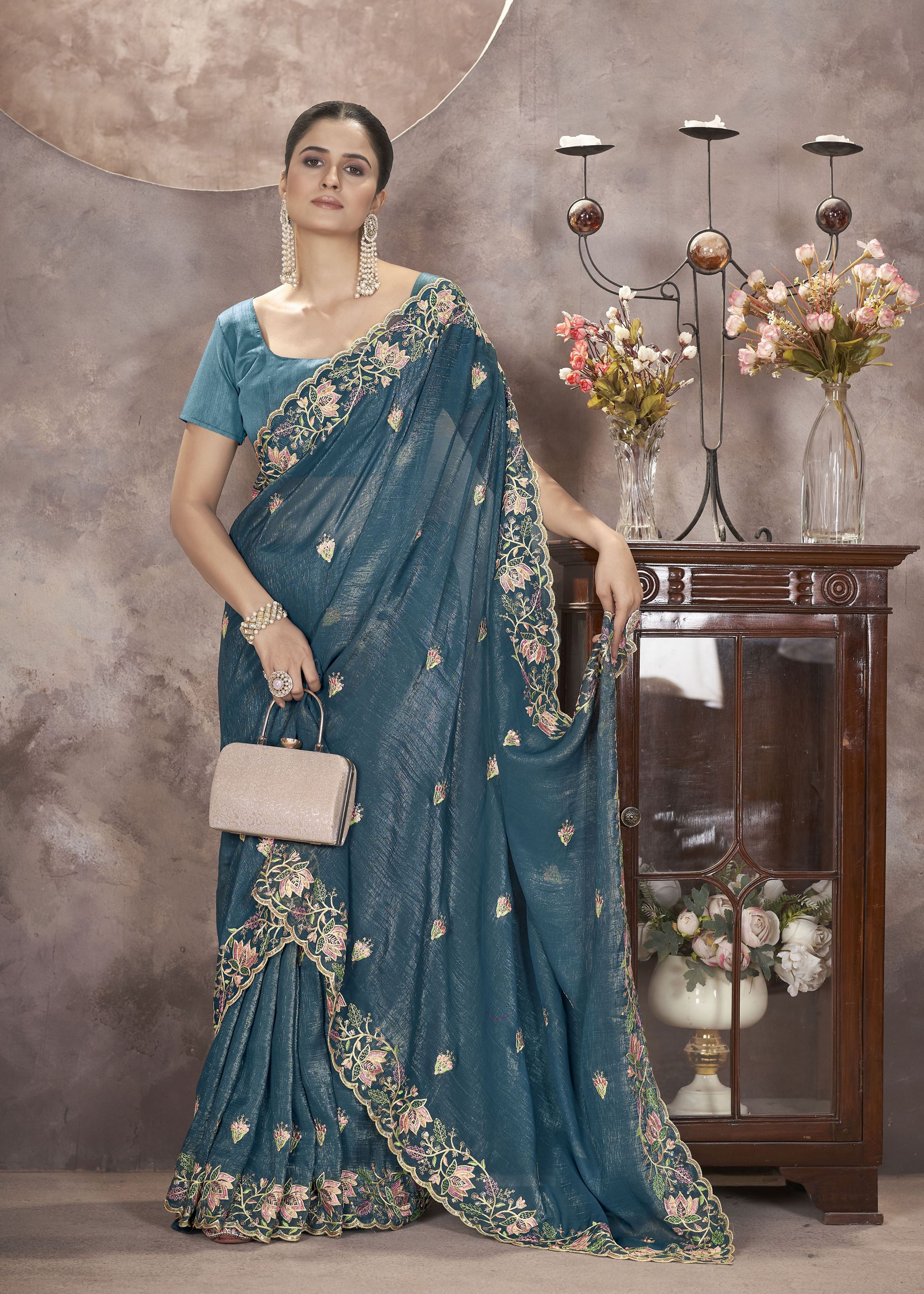 Blue Gold Crunchy Ethnic Partywear Glamorous Saree