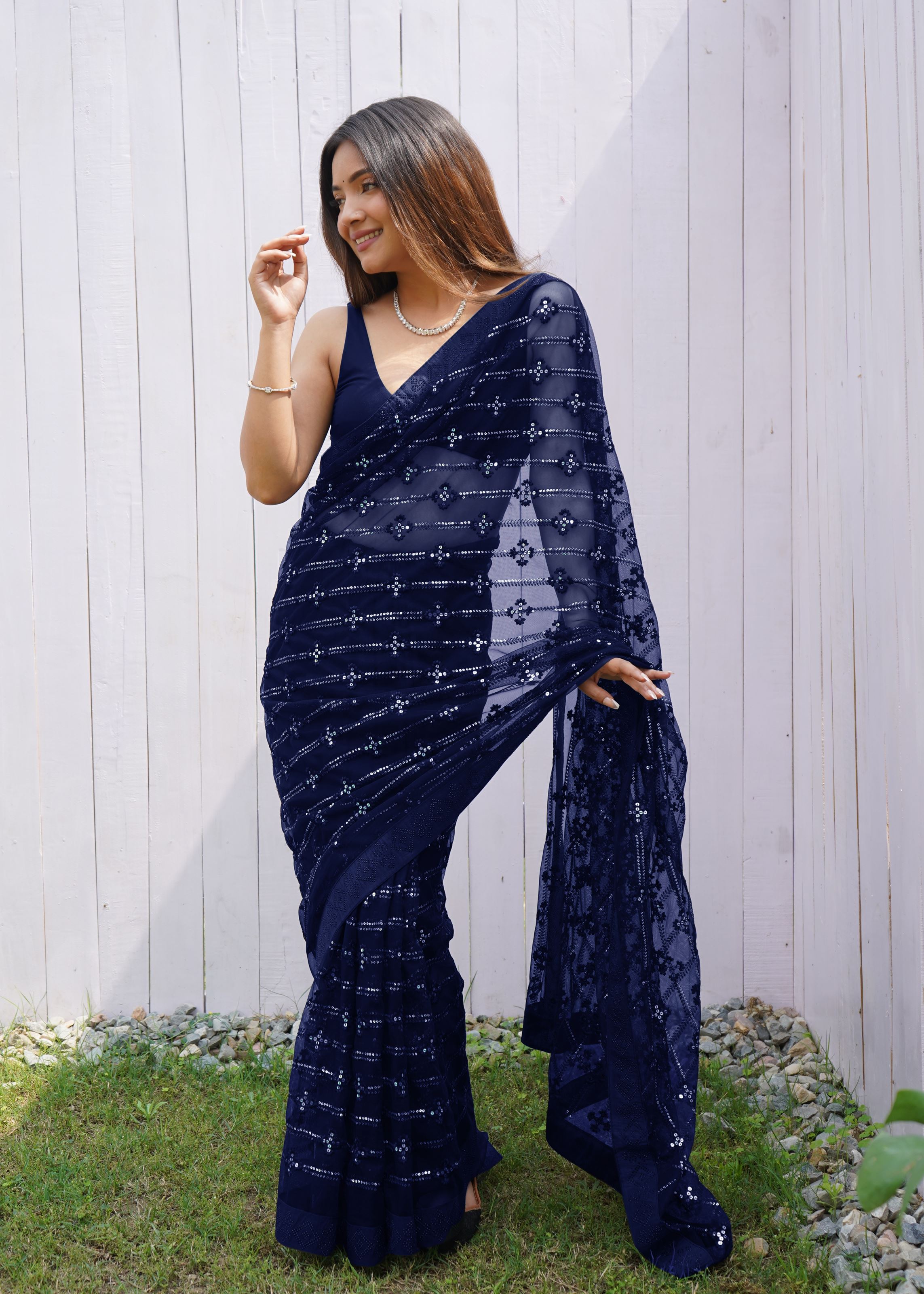 Redefine elegance with this Blue Butterfly Net Saree from Aethnofit Fashions. Designed in premium net fabric, this saree is beautifully detailed with sequins embroidery and sparkling diamond work, giving it a luxurious and graceful finish. The lightweight butterfly net fabric drapes effortlessly, while the vibrant blue color enhances its sophisticated appeal, making it a stunning choice for weddings, receptions, festive gatherings, and evening parties.