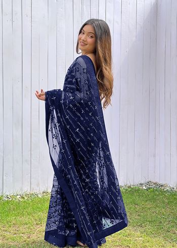 Blue Graceful Butterfly Net Sequins Embroidery Saree With Diamond Work