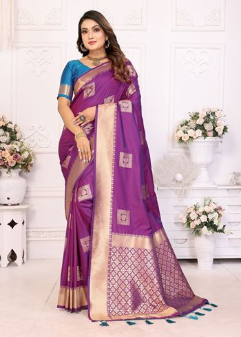 Paired with a contrasting purple silk blend blouse, this saree creates a striking and graceful ensemble. The rich blue hue enhances its regal appeal, while the delicate zari detailing highlights traditional artistry with a modern touch. This designer saree combines classic elegance with contemporary style, making it an ideal choice for festive occasions and ceremonial events.