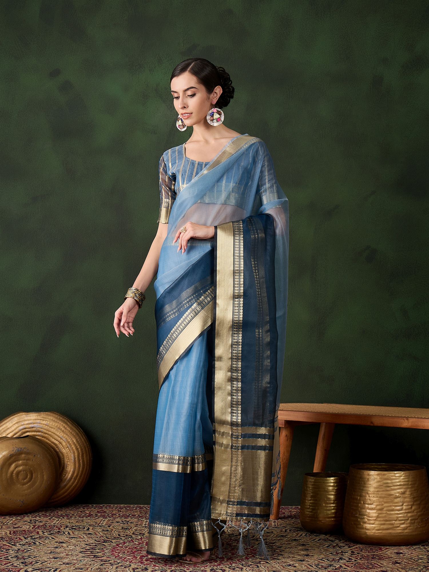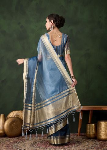 Blue Khadi Organza Fabric Beautiful Woven Jacquard Designer Saree