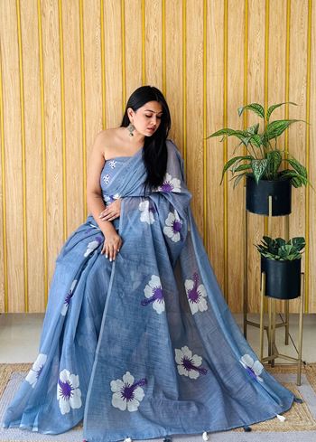 It comes with a matching blue linen blouse fabric, allowing you to tailor it into a stylish blouse design that complements your personality—be it sleeveless, boat neck, or classic round cut. Pair it with silver or oxidized jewelry for a chic day look, or add pearls and statement accessories for a festive twist.The Blue Linen Floral Printed Saree is more than just attire—it’s a graceful expression of simplicity, charm, and timeless beauty. A must-have for women who adore floral elegance with modern flair.